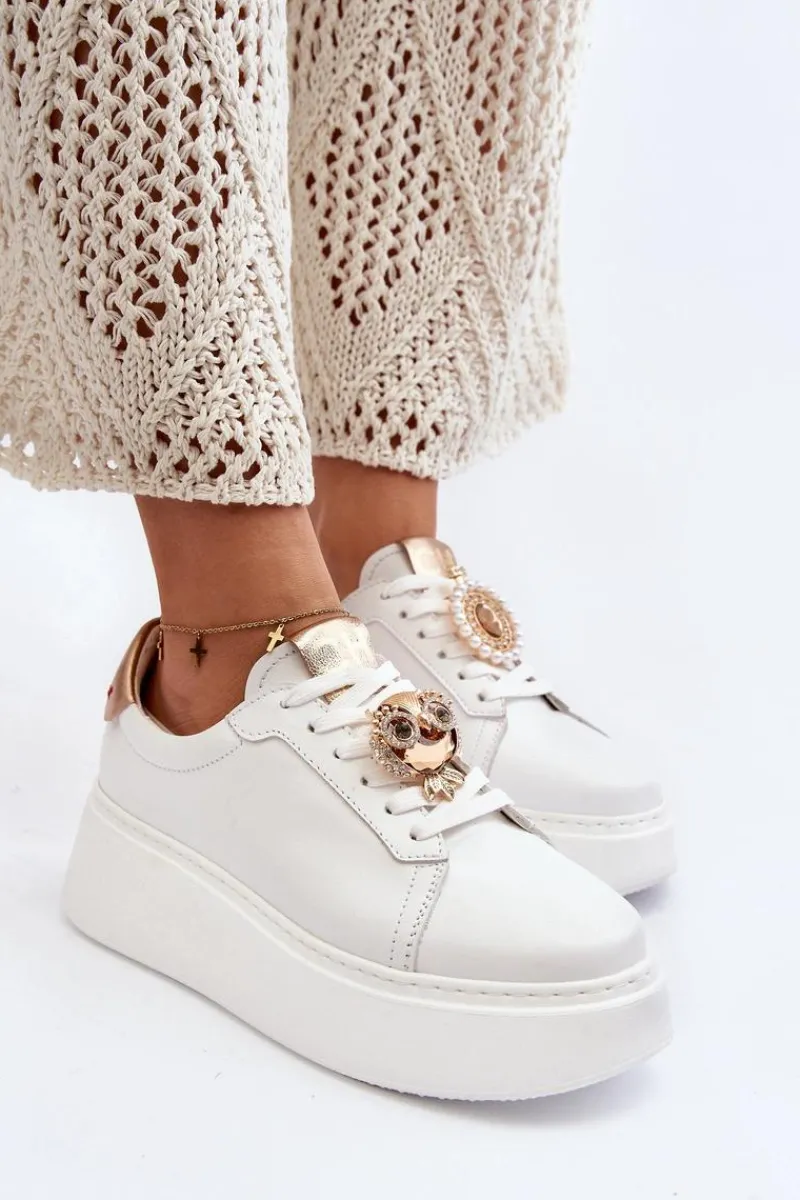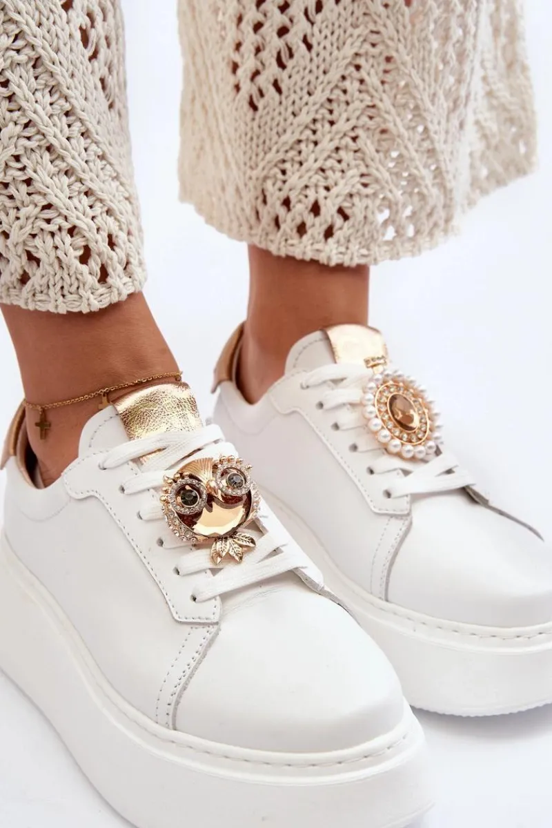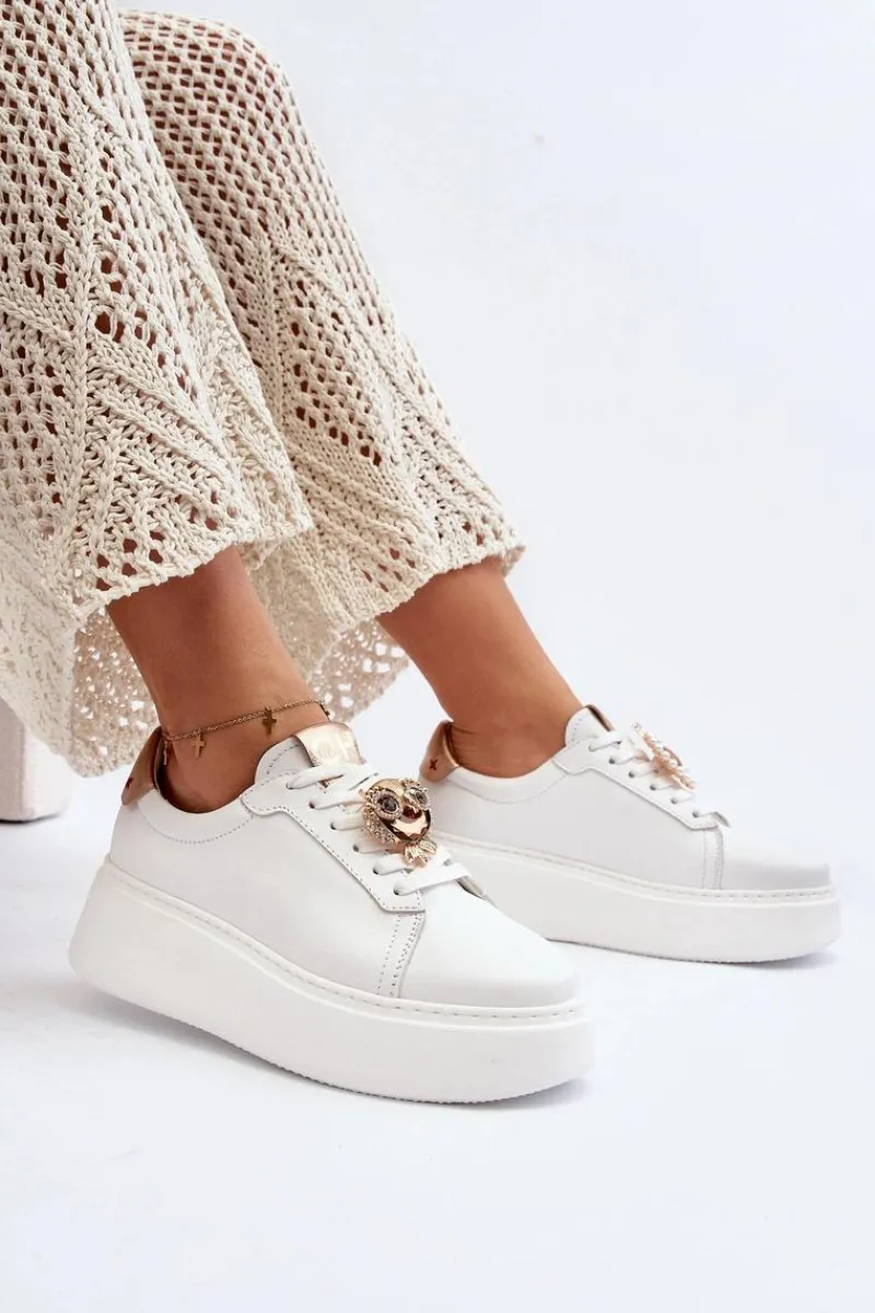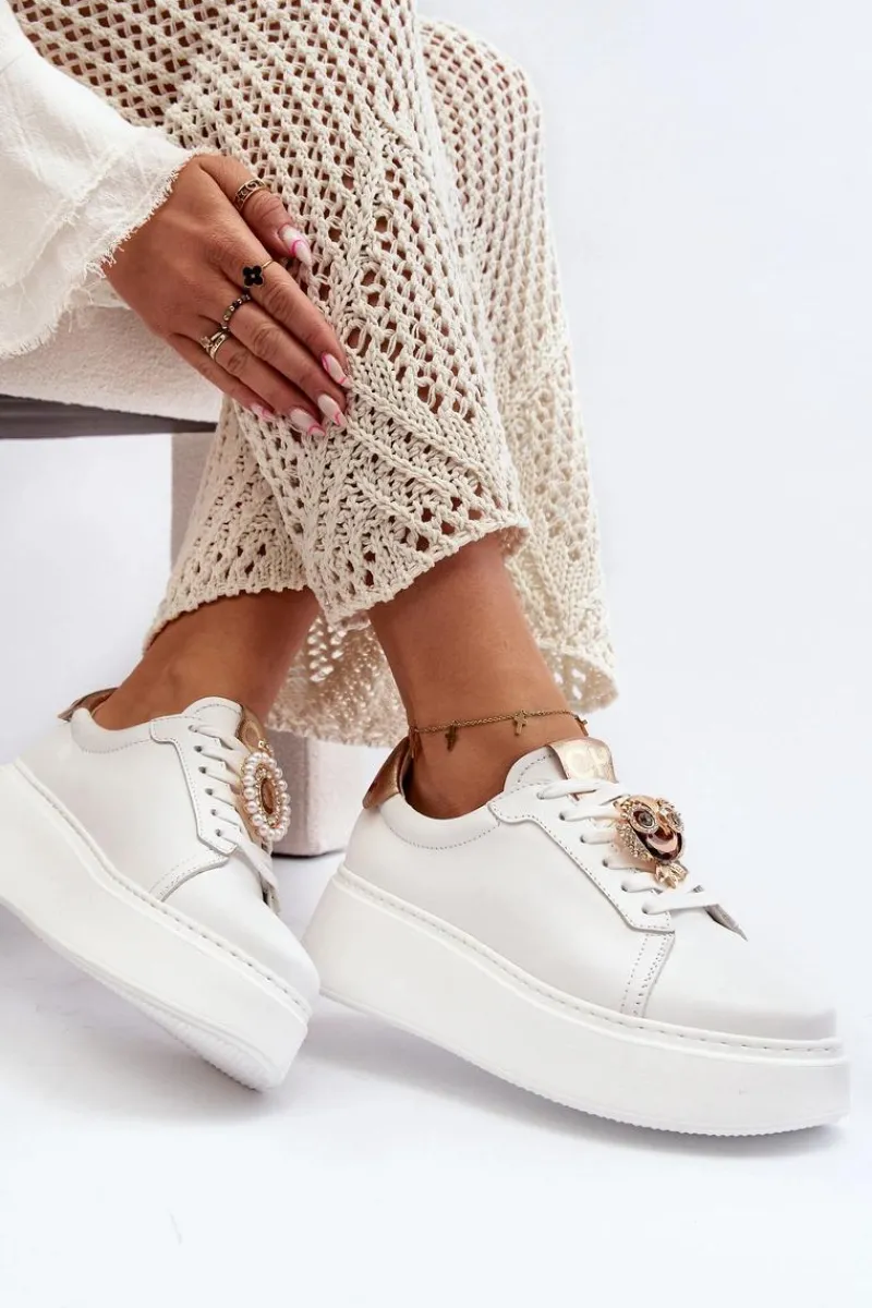 Sneakersy damskie od marki CheBello. Wykonane z wysokiej jakości skóry naturalnej. Osadzone na platformie z gumowego tworzywa. Na sznurowaniu znajduje się ozdobna broszka. Model ten to świetna propozycja dla osób, które chcą połączyć wygodę z elegancją w codziennych stylizacjach! Przy wyborze rozmiaru prosimy sugerować się tabelą rozmiarów.