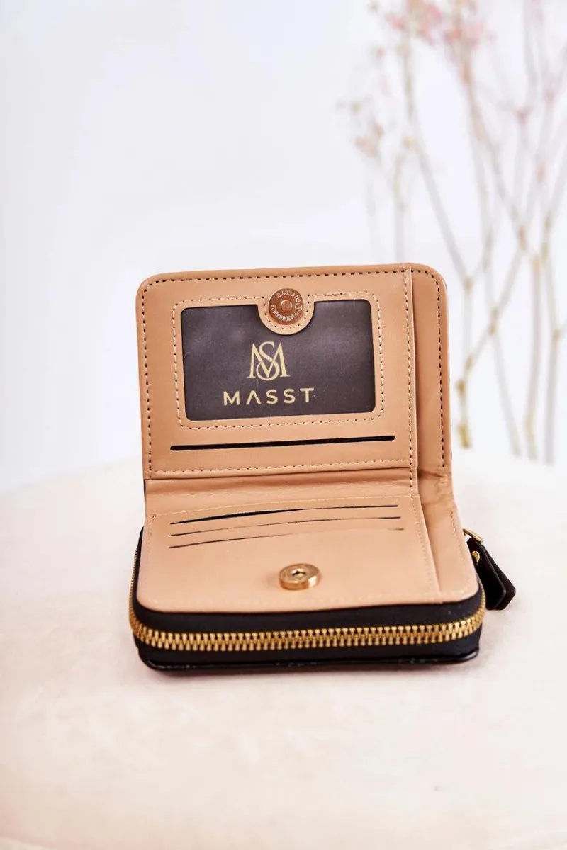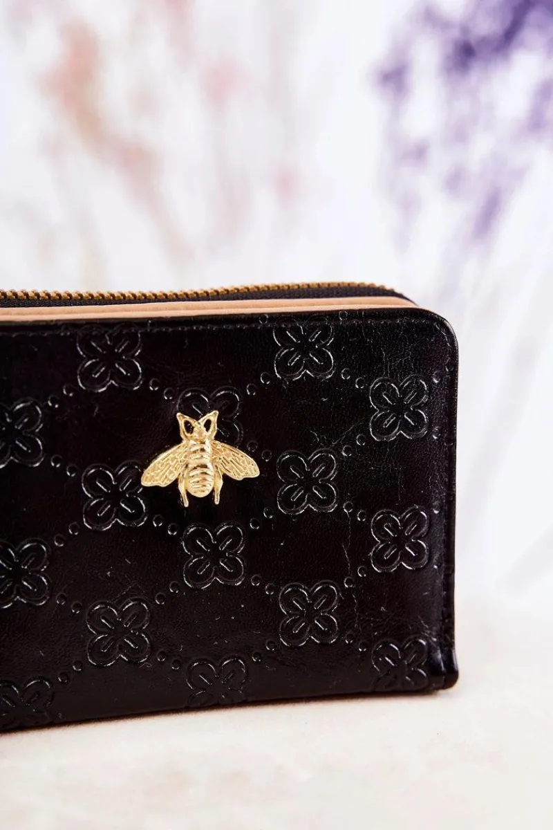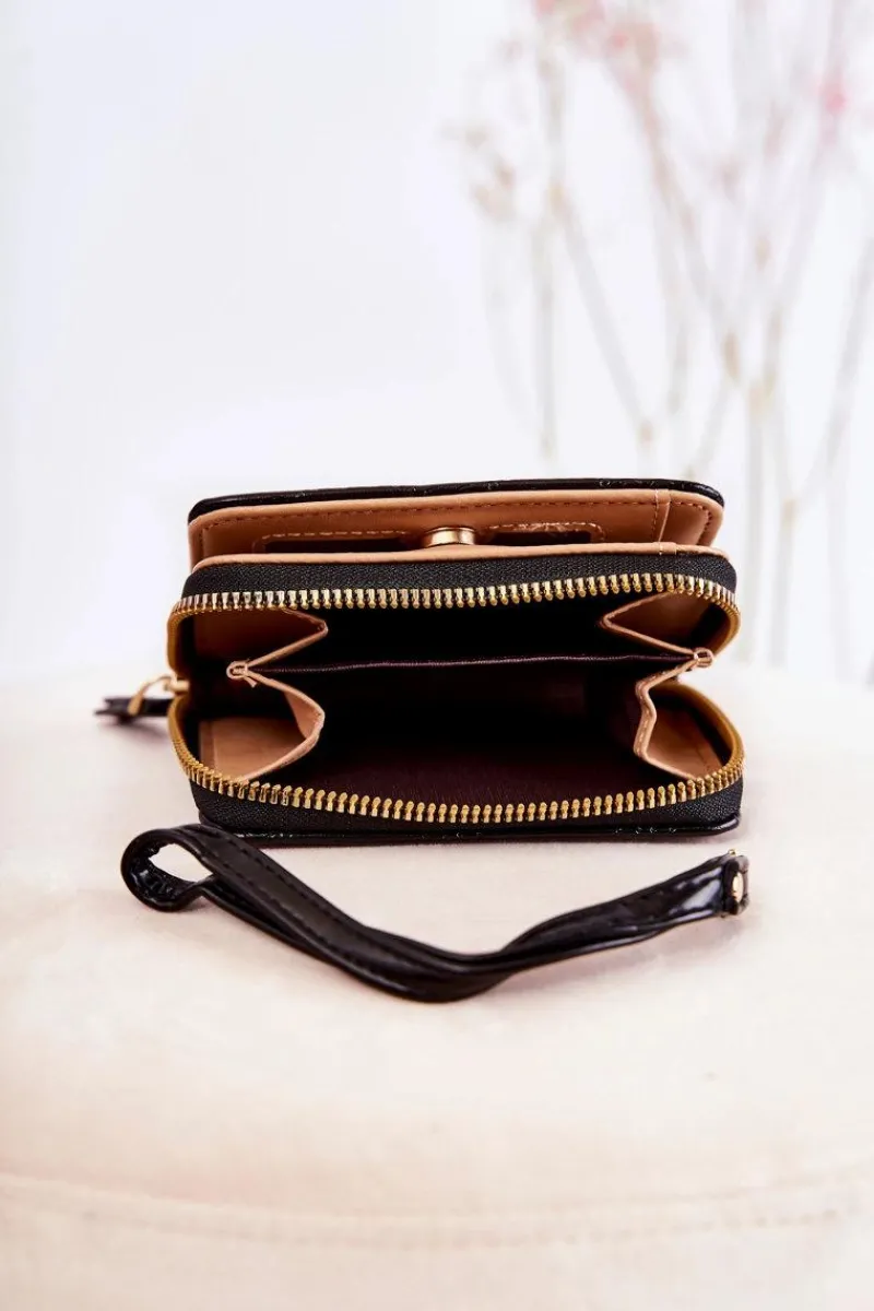 Mały, elegancki portfel został wykonany z eko skóry z tłoczeniem na całości. Zapinany na magnes oraz suwak. W środku posiada kilka kieszeni na karty czy wizytówki, miejsce na banknoty, a także miejsce na fotografię. Zamykana na suwak kieszonka pomieści bilony. Na przodzie umieszczono modny emblemat. Portfel dodatkowo posiada dopinany pasek. Ten niezbędny dodatek każdej kobiety sprawdzi się także idealnie jako prezent!