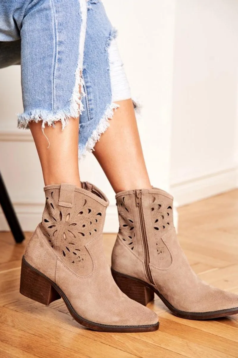 Botki to nie tylko buty na chłodne dni. Świetnie sprawdzą się również podczas tworzenia wiosennych stylizacjach. Botki posiadają zamek z boku cholewki ułatwiający zakładanie. W całości wykonane ze skóry zamszowej, co gwarantuje nam komfort oraz wysoką jakość wykonania. Idealne do zwiewnych sukienek oraz jeansowych spodni. Przy wyborze rozmiaru prosimy sugerować się tabelą rozmiarów.