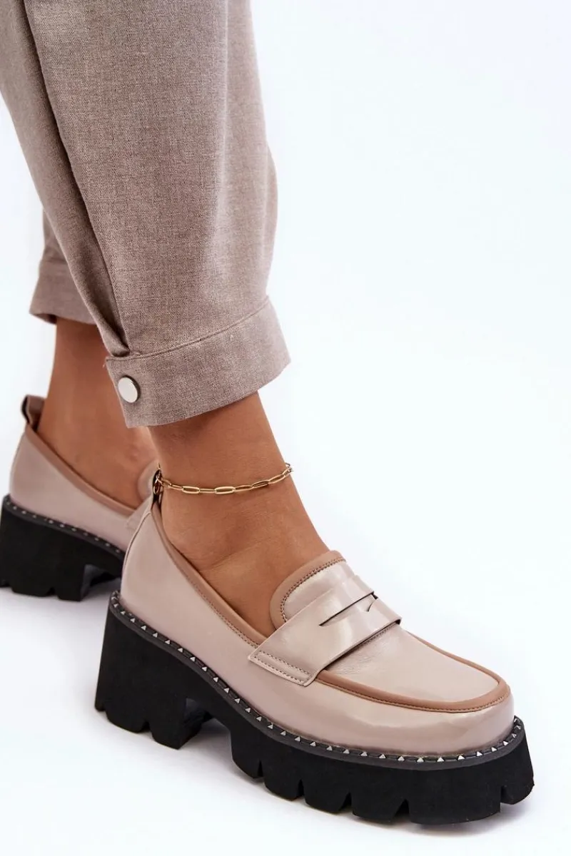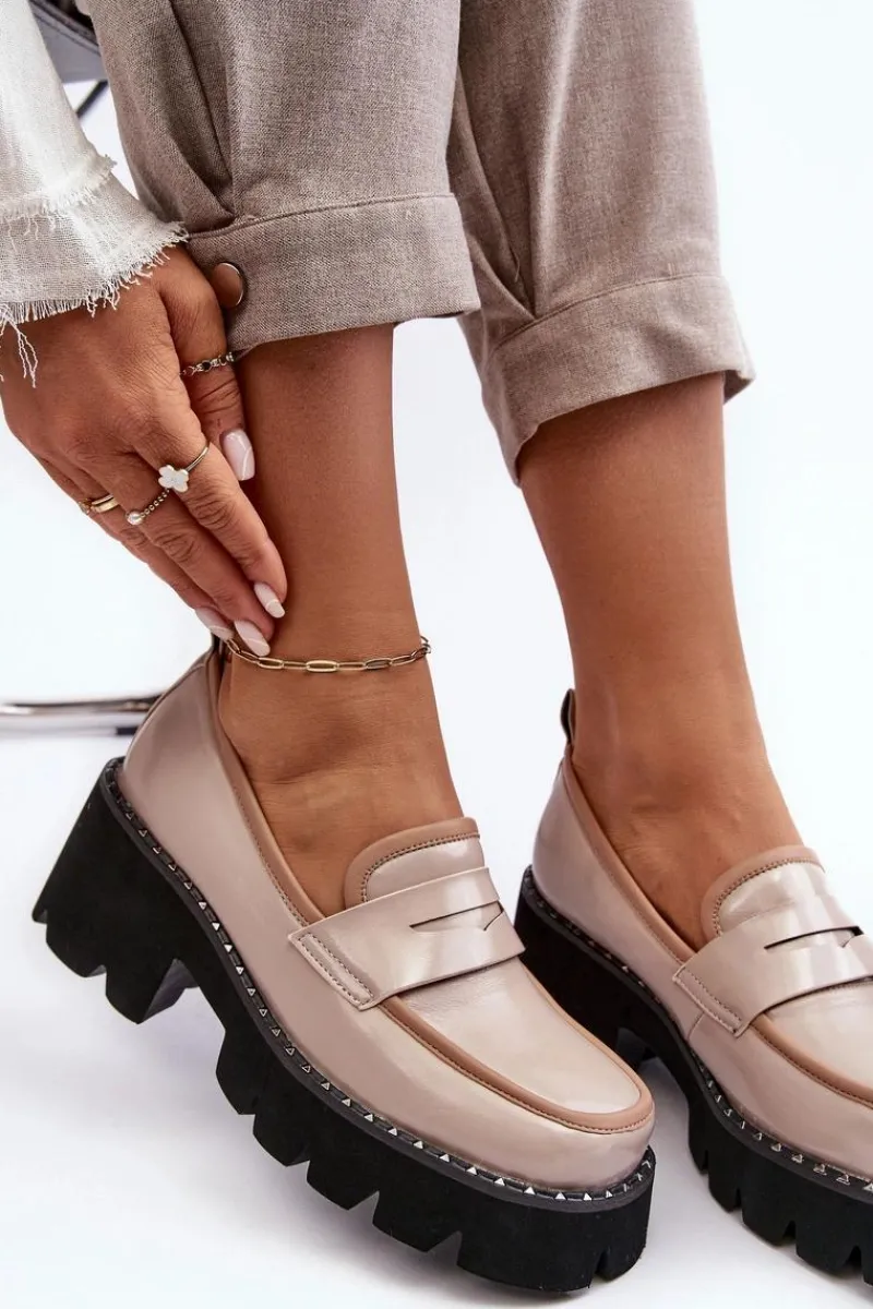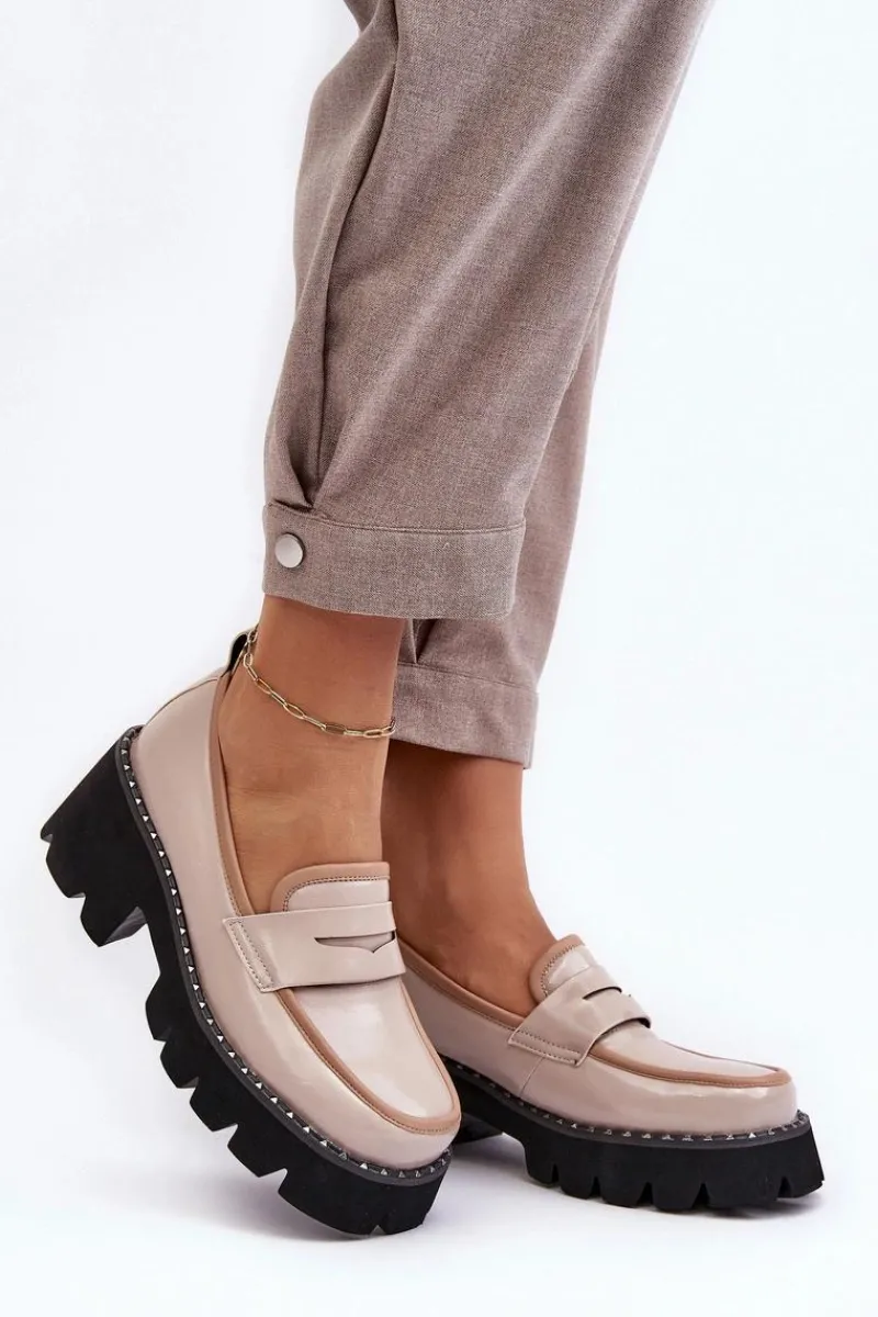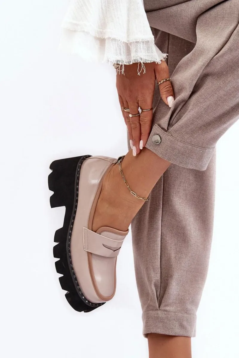 Damskie mokasyny zostały wykonane z eko skóry. Na przodzie posiadają ozdobny paseczek z wycięciem. Model ten został osadzony na płaskim obcasie i platformie, która dodatkowo została ozdobiona ćwiekami. Mokasyny posiadają wkładkę z naturalnej skóry. Ten model jest świetny na sezon wiosenno-jesienny! Przy wyborze rozmiaru prosimy sugerować się tabelą rozmiarów.