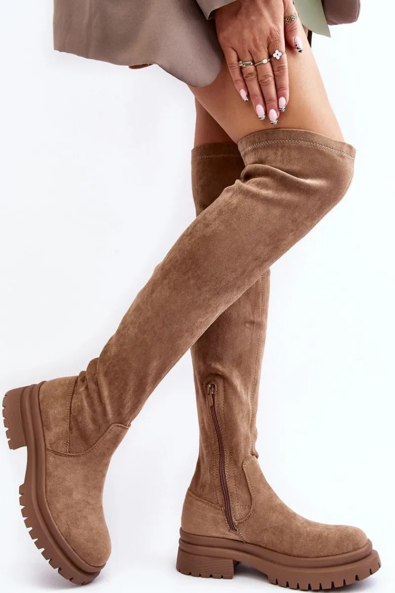 Damskie kozaki z cholewką za kolano. Wykonane z eko zamszu. Osadzone na masywnej podeszwie i płaskim obcasie. Noski zaokrąglone. Usztywniony zapiętek. Wkładka lekko ocieplona kocem obuwniczym. Klasyczny fason sprawdzi się do wielu jesienno-zimowych stylizacji! Przy wyborze rozmiaru prosimy kierować tabelą rozmiarów.