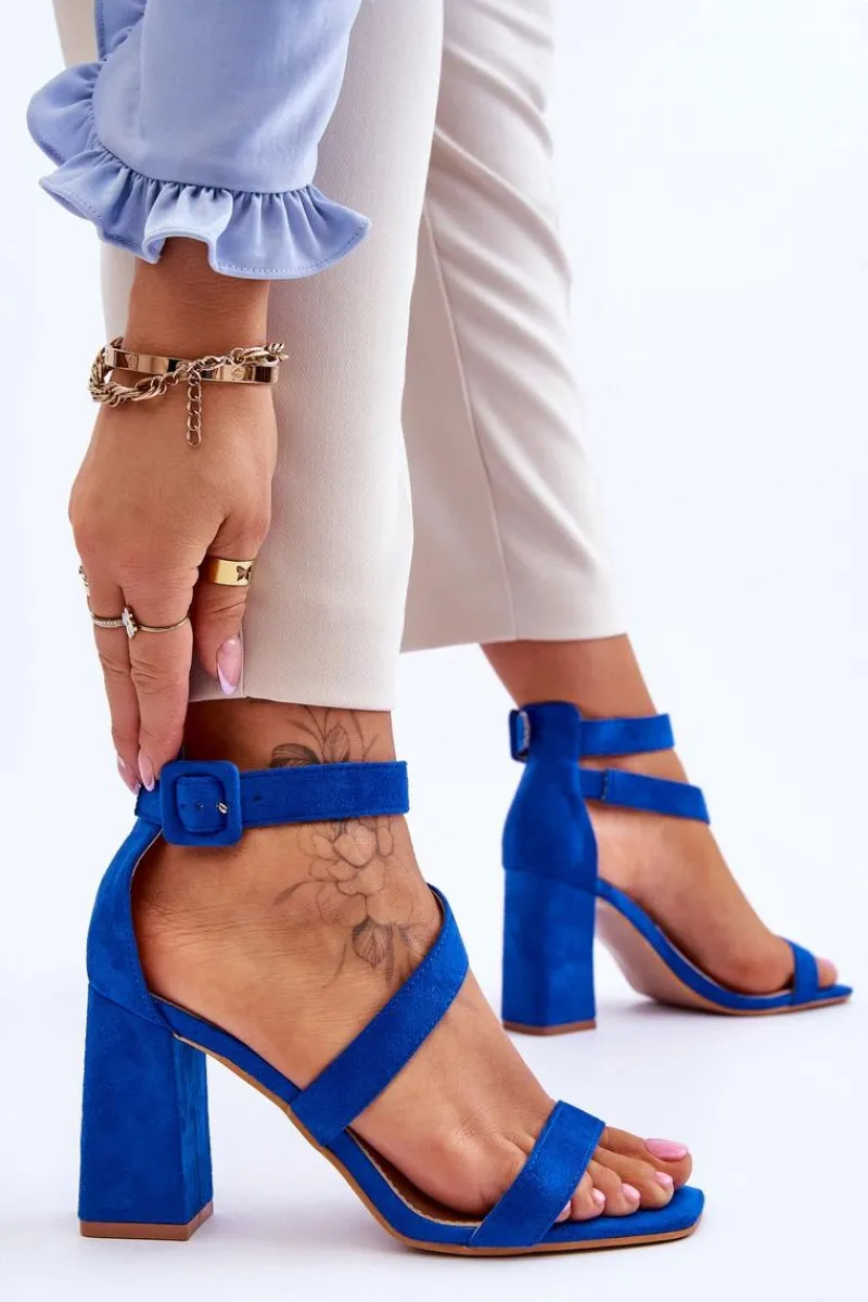 Modne sandałki damskie na obcasie w postaci słupka. Wykonane z eko zamszu z dodatkowym paseczkiem przechodzącym przez środek obuwia. Zapinane wokół kostki na regulowany pasek ze sprzączką. Wkładka z eko skóry jest miękka i wygodna w użytkowaniu. Buty te świetnie sprawdzą się w upalne dni podczas randki, uroczystości czy ważnego spotkania. Przy wyborze rozmiaru prosimy sugerować się tabelą rozmiarów.