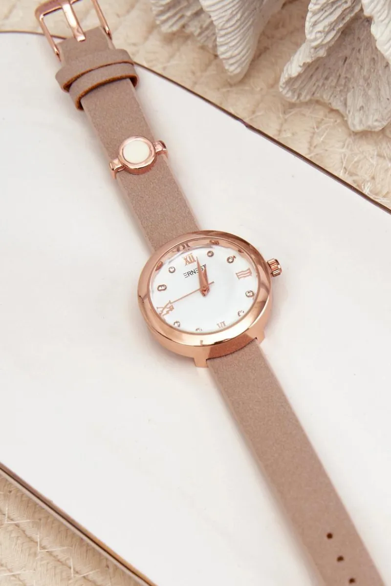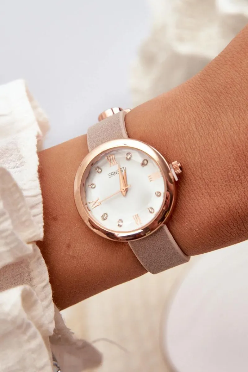 Damski zegarek na eko skórzanym pasku marki Ernest. Tarcza zegarka ozdobiona cyrkoniami dodaje mu wyjątkowego blasku i uroku. Dzięki możliwości regulacji paska, zegarek doskonale dopasowuje się do każdej wielkości nadgarstka, zapewniając komfort noszenia i stylowy wygląd. Idealny wybór zarówno na codzień jak i na bardziej specjalne okazje.