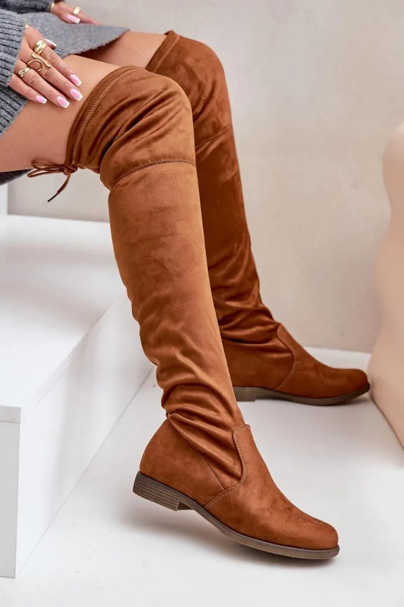 Damskie kozaki z cholewką sięgającą za kolano, wykonane z ekologicznego zamszu. Osadzone na płaskim, stabilnym obcasie z zaokrąglonymi noskami i usztywnionym zapiętkiem. Model wsuwany z regulowaną górą cholewki. Doskonale komponują się z sukienkami i spódnicami. Przy wyborze rozmiaru prosimy kierować tabelą rozmiarów.