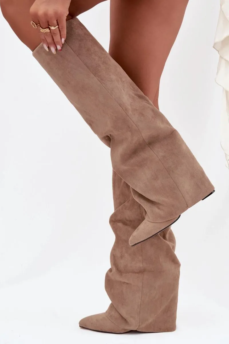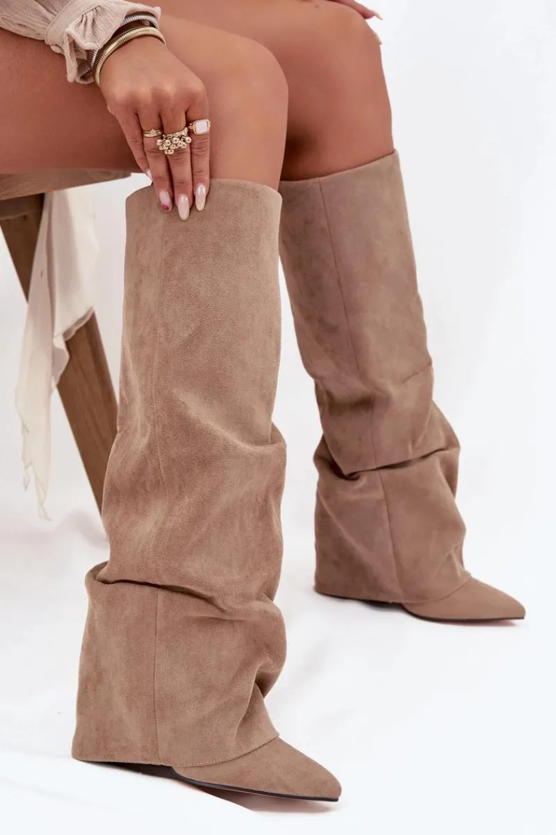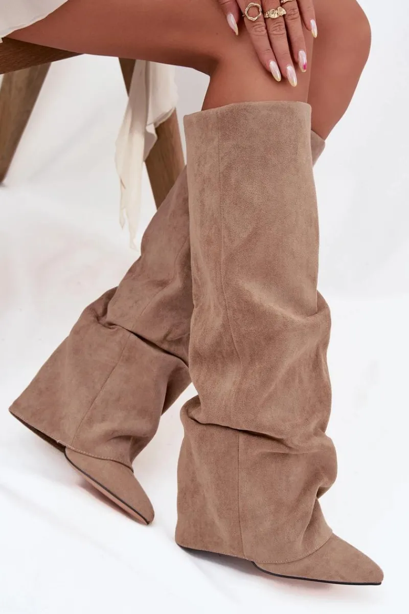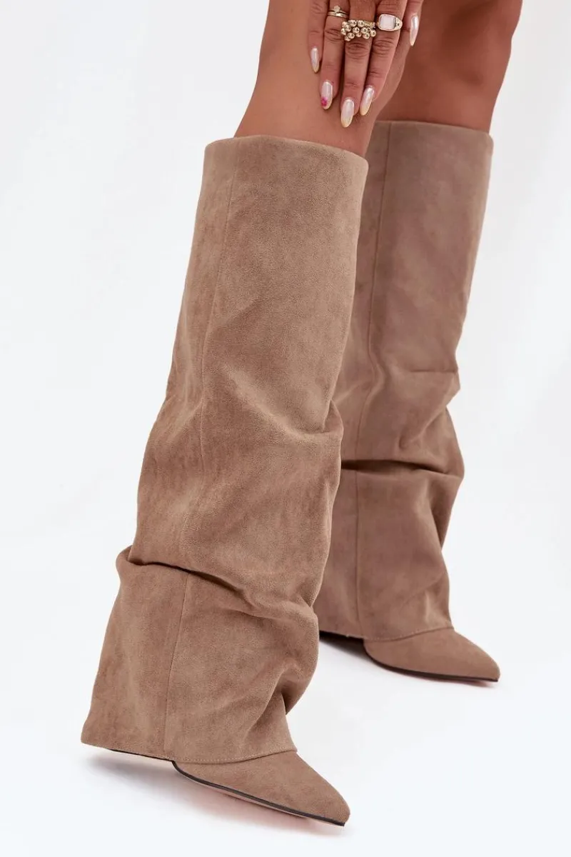 Kozaki damskie z wywiniętą cholewką to prawdziwy must-have na nadchodzący sezon jesienno-zimowy! Wsuwane i osadzone na stabilnym obcasie typu słupek, gwarantują wygodę i pewny krok. Ocieplenie zapewnia komfort w chłodniejsze dni, a wywinięta cholewka, nachodząca na obcas, dodaje im oryginalnego charakteru. Szpiczaste noski podkreślają kobiecy styl, dzięki czemu kozaki świetnie sprawdzą się w efektownych, zimowych stylizacjach. Przy wyborze rozmiaru prosimy sugerować się tabelą rozmiarów.