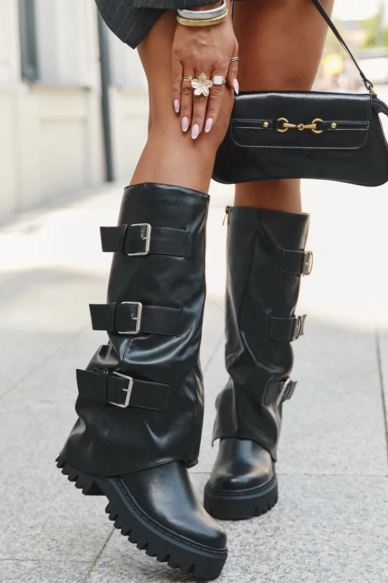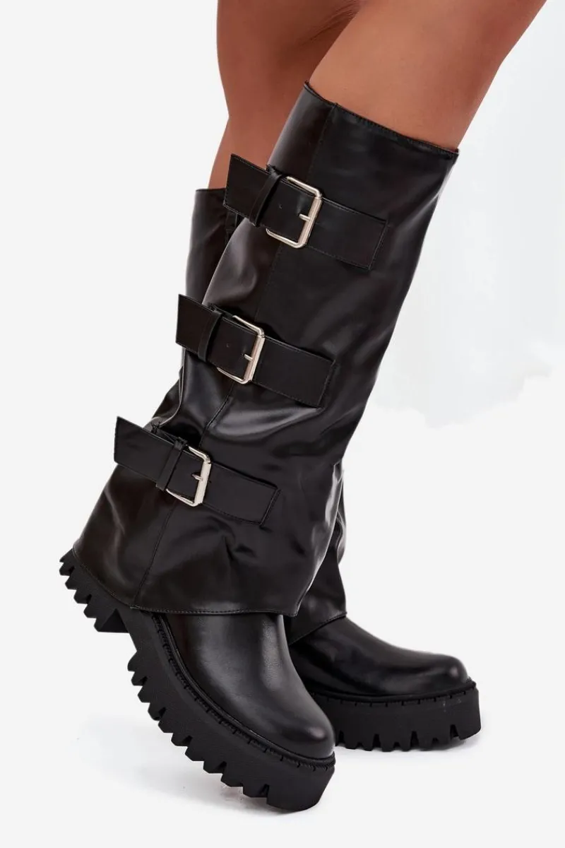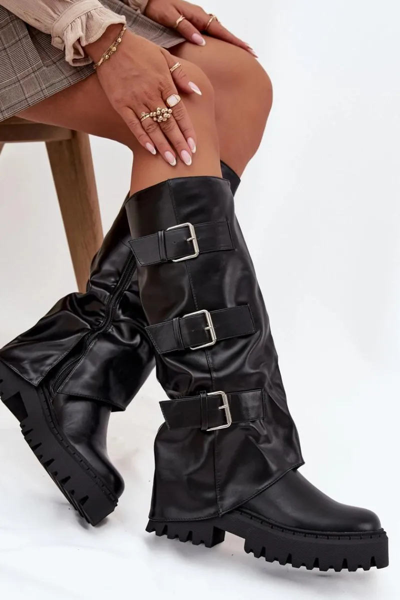 Stylowe kozaki damskie wykonane z eko skóry to idealny wybór dla kobiet ceniących modny wygląd i wygodę. Osadzone na platformie z płaskim obcasem gwarantują stabilność oraz komfort noszenia przez cały dzień. Model wyróżnia się efektowną, wywiniętą cholewką, która nadaje całości oryginalnego charakteru. Trzy srebrne klamry z paskami to detal przyciągający uwagę i dodający wyrazistego, nowoczesnego stylu. Kozaki zapinane są na zamek, co ułatwia ich zakładanie i zdejmowanie. Wnętrze zostało ocieplone, dzięki czemu buty doskonale sprawdzą się w chłodniejsze dni. To model, który świetnie prezentuje się zarówno w casualowych stylizacjach z jeansami, jak i w zestawieniu z sukienką czy spódnicą, dodając każdemu outfitowi nuty charakteru.