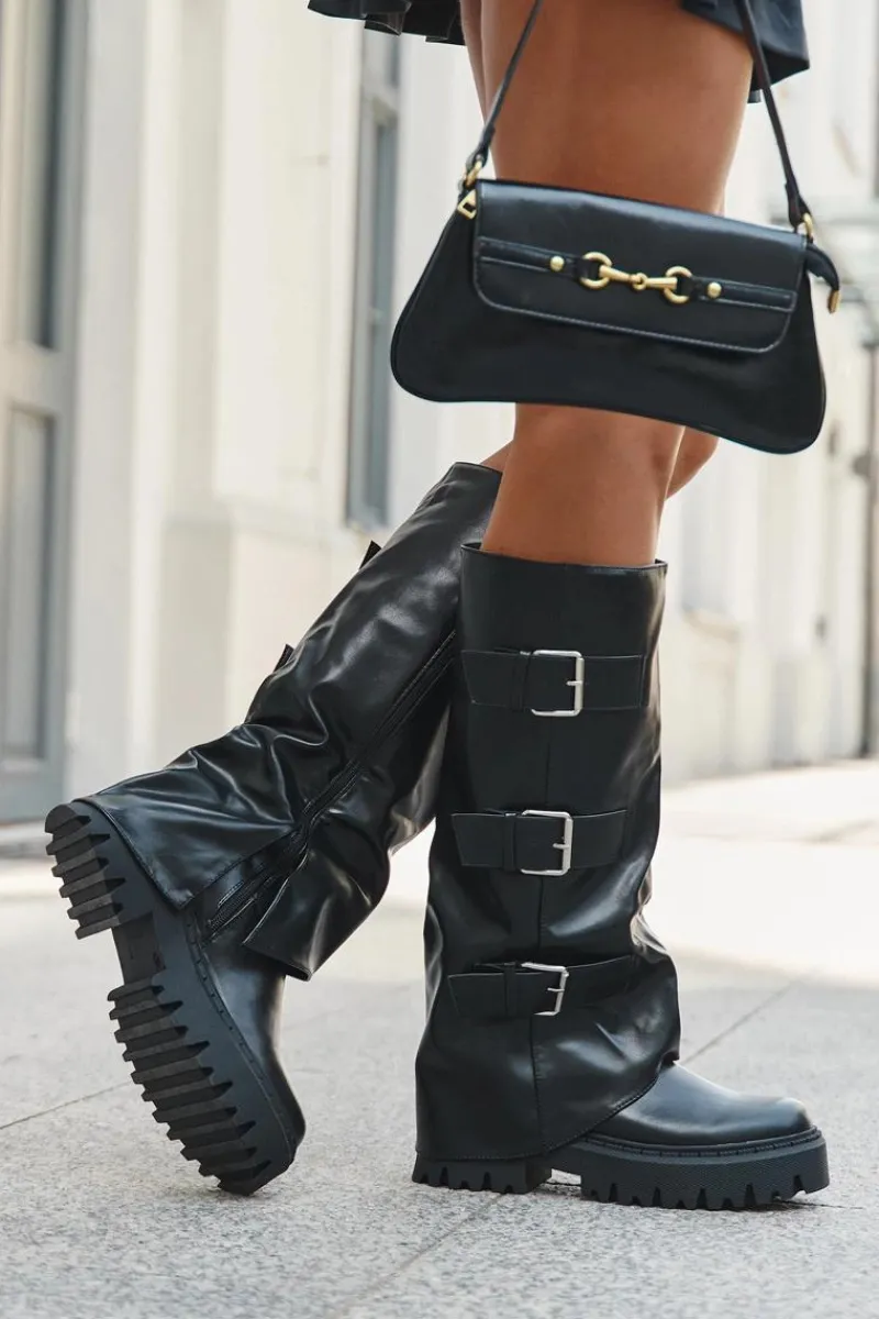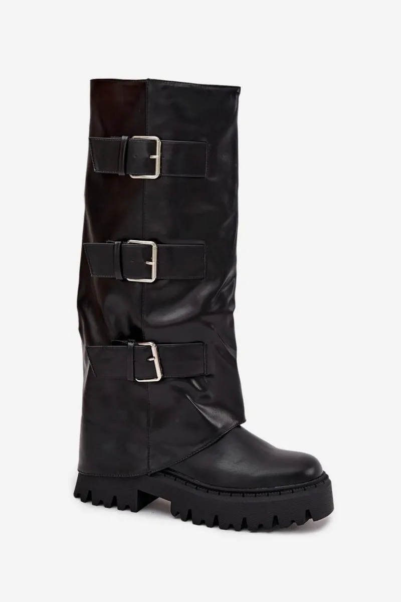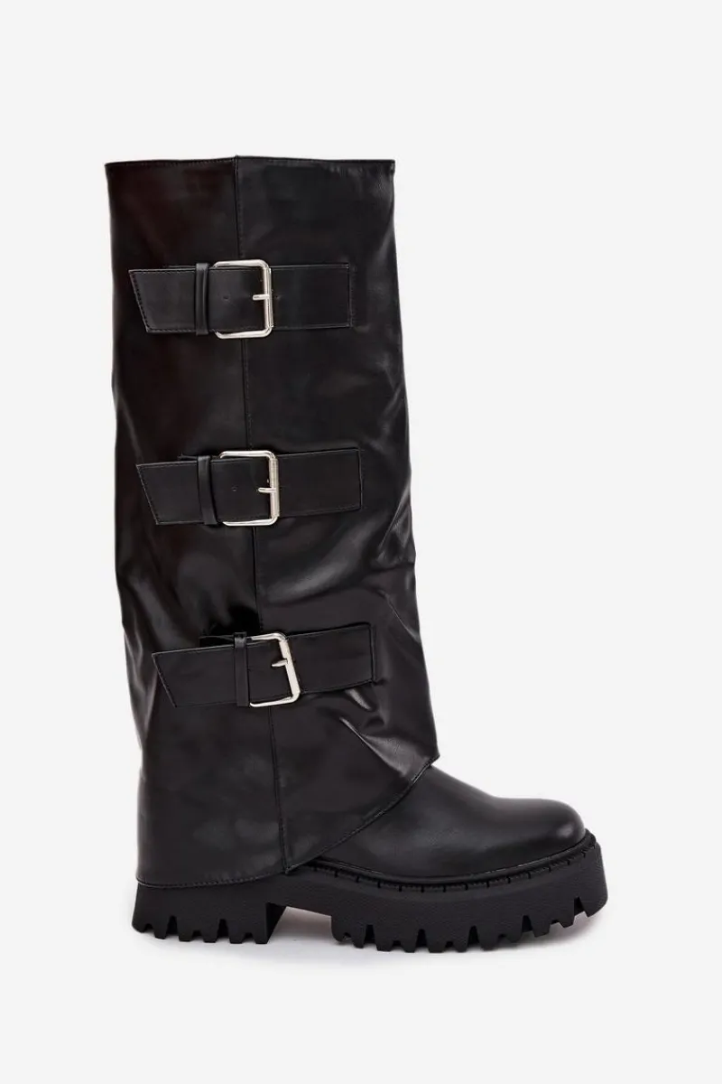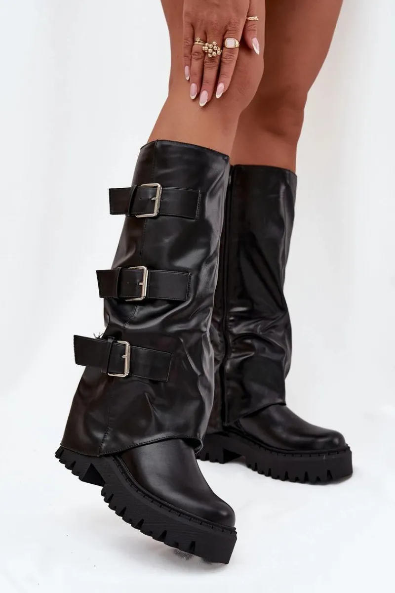 Stylowe kozaki damskie wykonane z eko skóry to idealny wybór dla kobiet ceniących modny wygląd i wygodę. Osadzone na platformie z płaskim obcasem gwarantują stabilność oraz komfort noszenia przez cały dzień. Model wyróżnia się efektowną, wywiniętą cholewką, która nadaje całości oryginalnego charakteru. Trzy srebrne klamry z paskami to detal przyciągający uwagę i dodający wyrazistego, nowoczesnego stylu. Kozaki zapinane są na zamek, co ułatwia ich zakładanie i zdejmowanie. Wnętrze zostało ocieplone, dzięki czemu buty doskonale sprawdzą się w chłodniejsze dni. To model, który świetnie prezentuje się zarówno w casualowych stylizacjach z jeansami, jak i w zestawieniu z sukienką czy spódnicą, dodając każdemu outfitowi nuty charakteru.