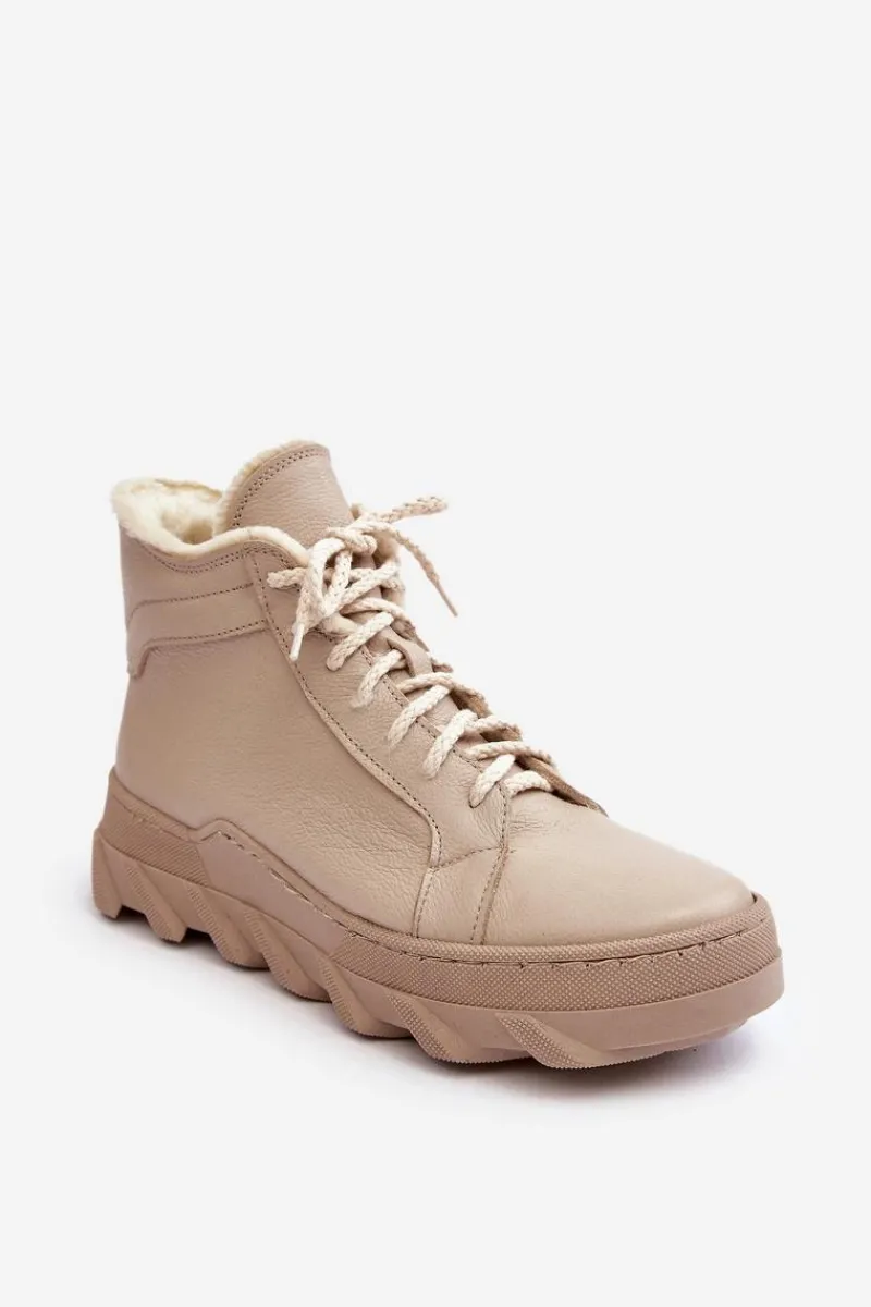 Botki damskie w sportowym stylu zostały wykonane ze skóry naturalnej. Osadzone na platformie z gumowego tworzywa. Wewnątrz ocieplone naturalną wełną. Zapinane na suwak z boku cholewki oraz dodatkowo posiadają sznurowanie. Cholewka za kostkę. Noski zaokrąglone. Usztywniony zapiętek. Przy wyborze rozmiaru prosimy sugerować się tabelą rozmiarów.