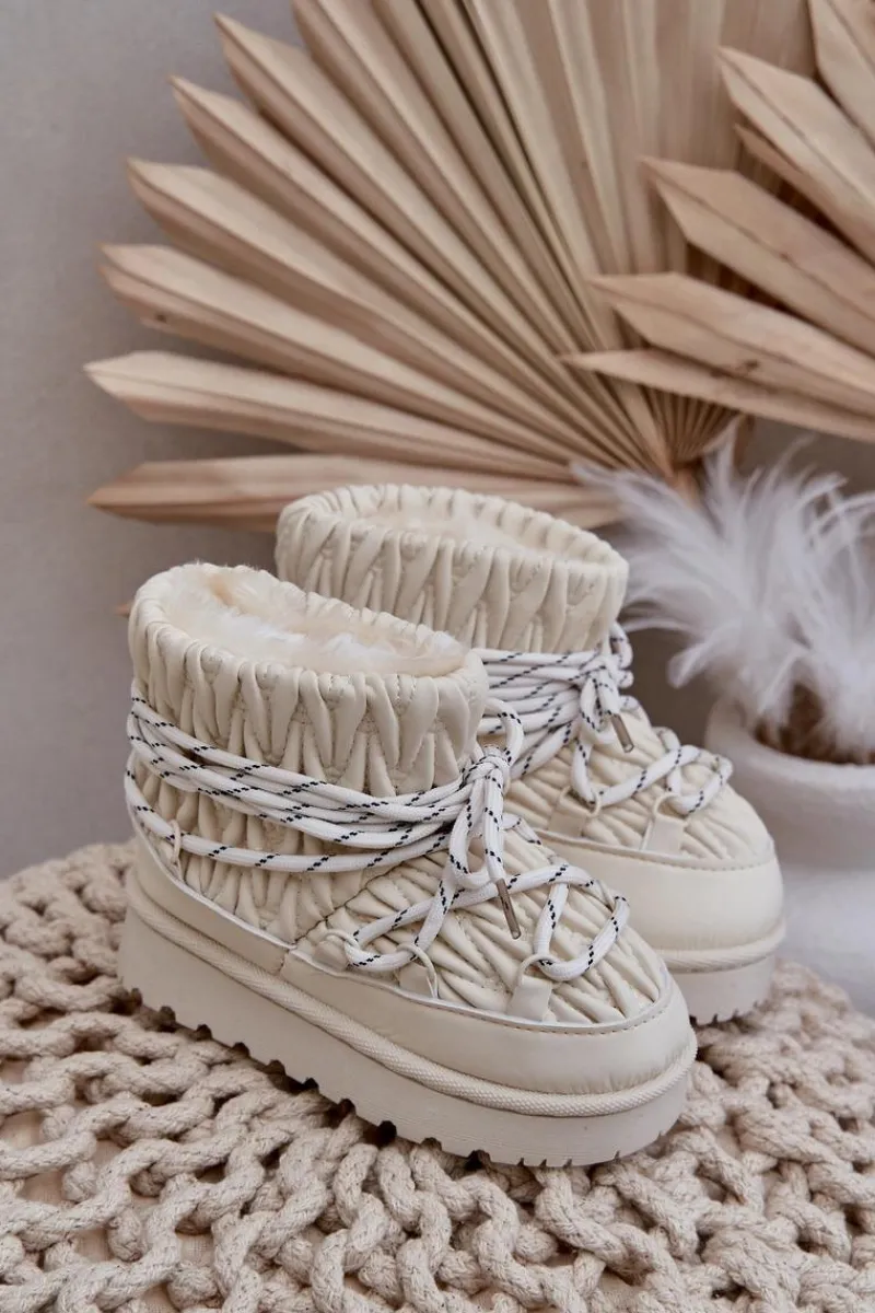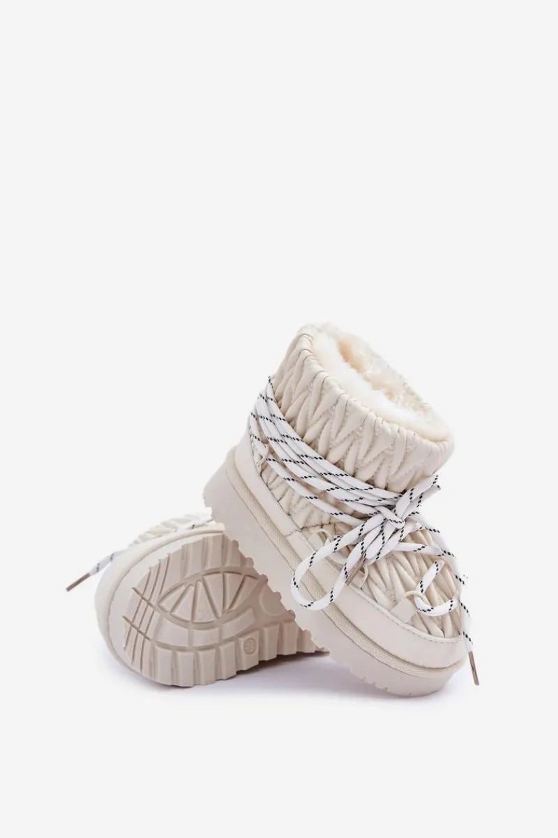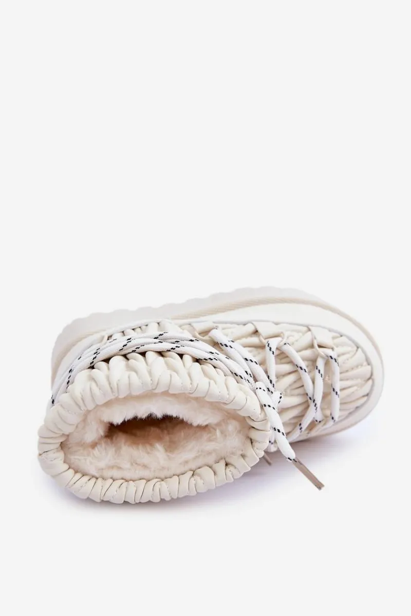 Śniegowce dziecięce wykonane z eko skóry to idealny wybór na mroźne dni i zimowe zabawy na świeżym powietrzu. Ocieplane grubym, miękkim futerkiem, zapewniają doskonałą izolację termiczną i komfort noszenia. Stylowa cholewka z efektownymi marszczeniami i dekoracyjnym wiązaniem dodaje im uroku. Podeszwa z gumowego tworzywa zapewni stabilność. Funkcjonalne i modne, sprawdzą się w każdej zimowej stylizacji! Przy wyborze rozmiaru prosimy kierować tabelą rozmiarów.