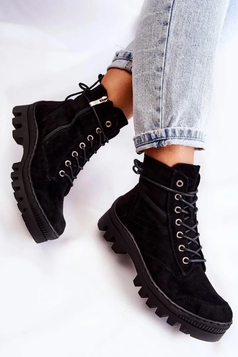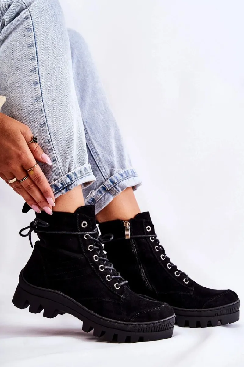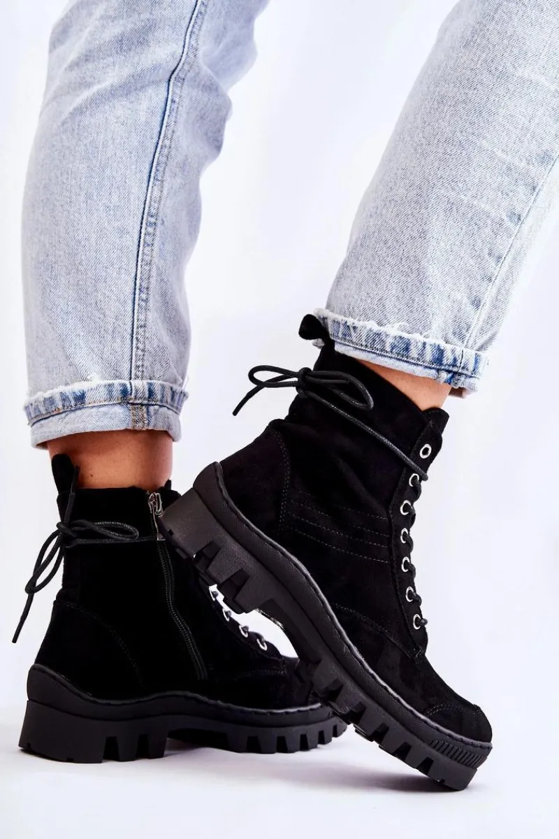 Botki osadzone na grubej platformie z wysokim bieżnikiem. Przód noska jest dodatkowo wzmocniony gumowym tworzywem. Zapinane po wewnętrznej stronie cholewki na zamek błyskawiczny, a także dodatkowo sznurowane. Wykonane z miękkiego eko zamszu z przeszyciem z boku. Usztywniany zapiętek. Stworzą świetny look z klasycznymi jeansami czy joggerami, a także dzianinową sukienką. Przy wyborze rozmiaru prosimy sugerować się tabelą rozmiarów.