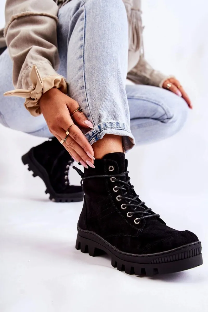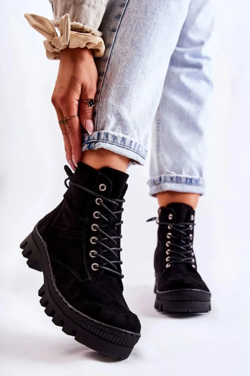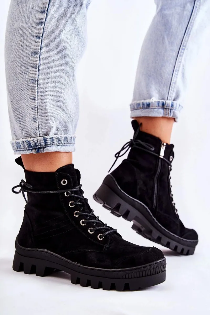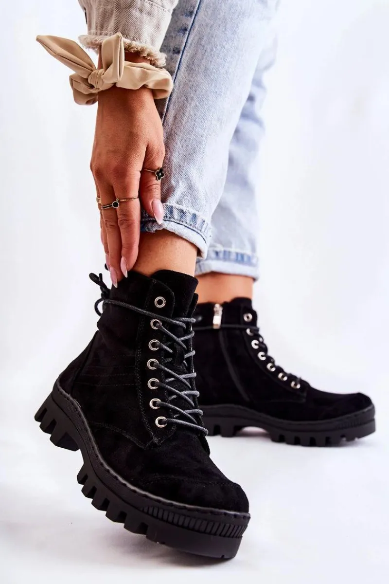Botki osadzone na grubej platformie z wysokim bieżnikiem. Przód noska jest dodatkowo wzmocniony gumowym tworzywem. Zapinane po wewnętrznej stronie cholewki na zamek błyskawiczny, a także dodatkowo sznurowane. Wykonane z miękkiego eko zamszu z przeszyciem z boku. Usztywniany zapiętek. Stworzą świetny look z klasycznymi jeansami czy joggerami, a także dzianinową sukienką. Przy wyborze rozmiaru prosimy sugerować się tabelą rozmiarów.