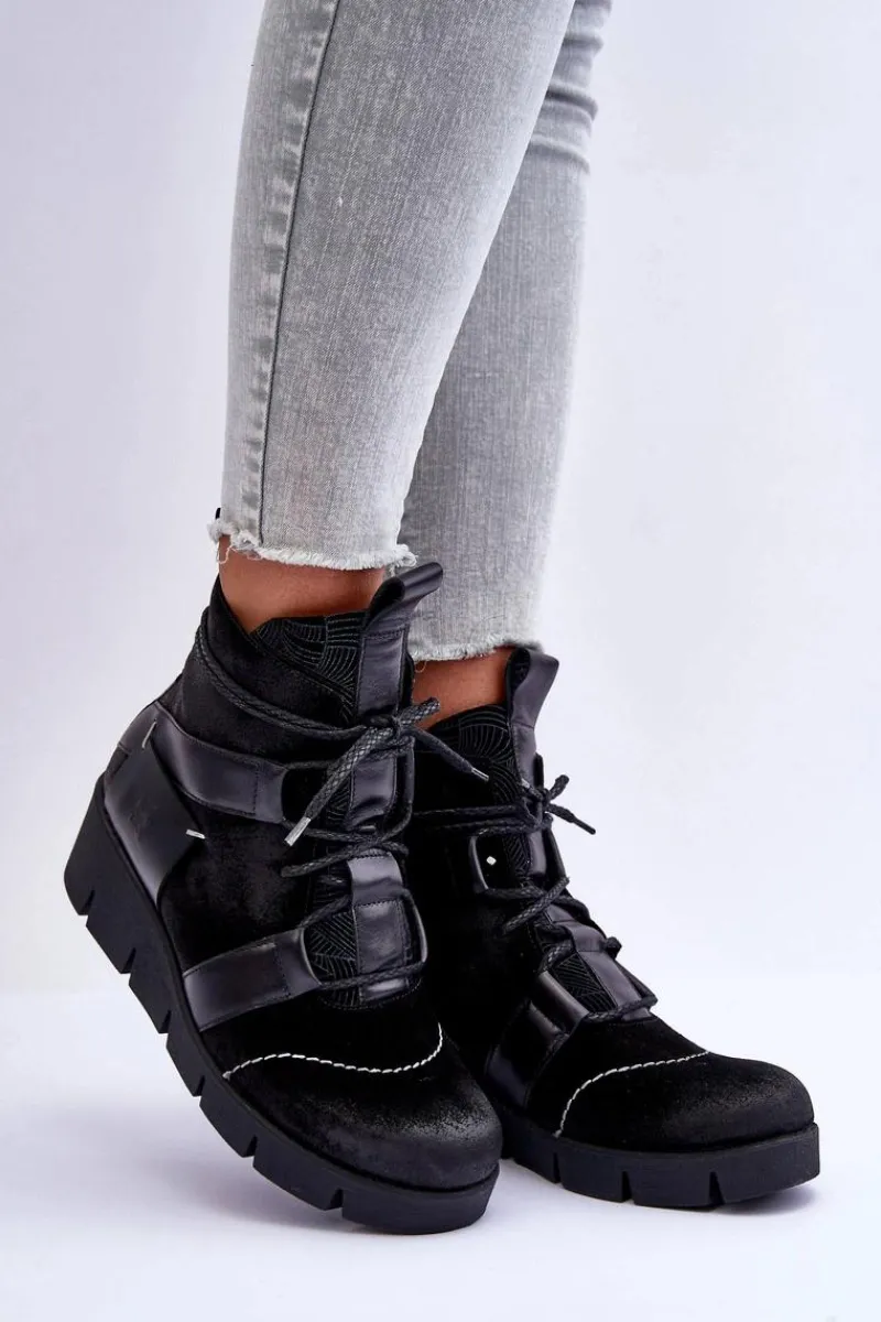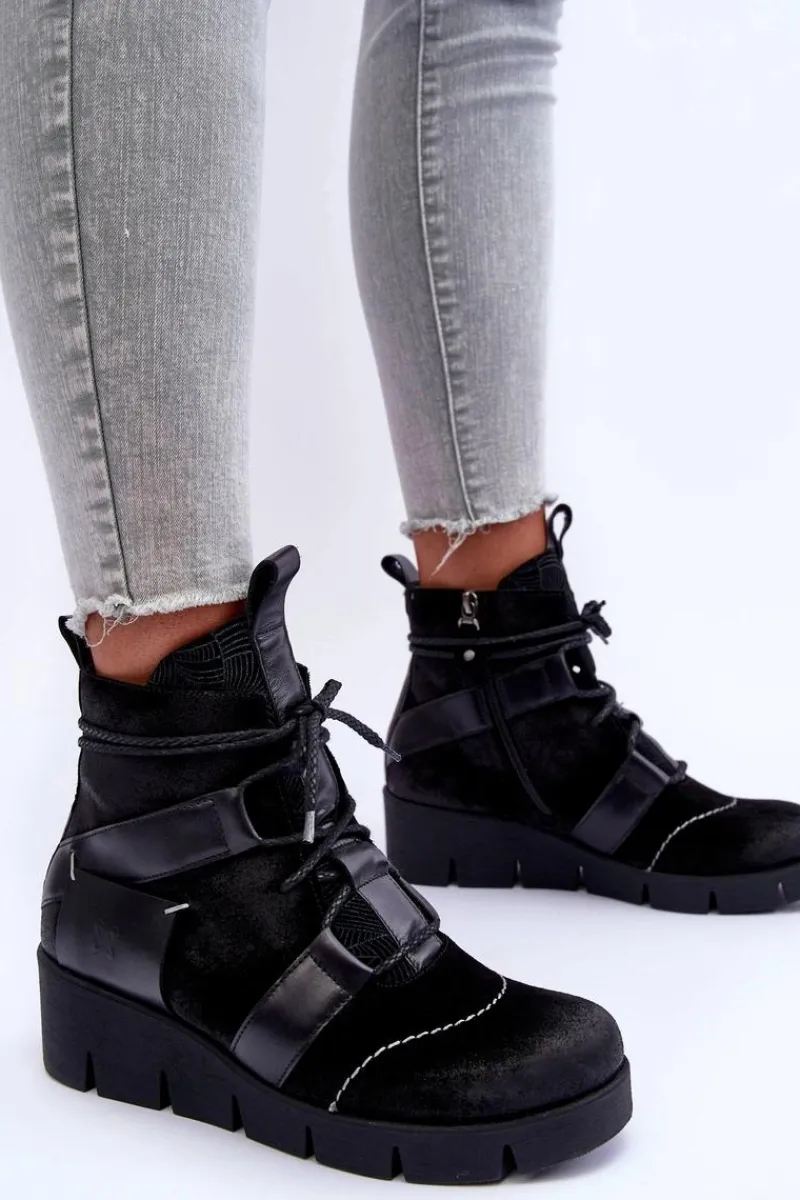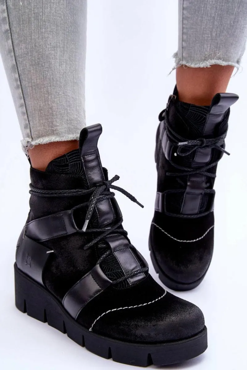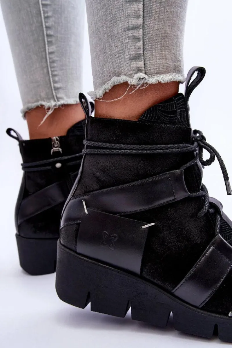 Botki damskie marki Maciejka zostały wykonane z najwyższej jakości skór naturalnych. Zapinane na suwak oraz wzbogacone dodatkowym sznurowaniem. Model ten osadzony został na koturnie. Miękka wkładka zapewni komfort podczas użytkowania. Przy wyborze rozmiaru prosimy sugerować się tabelą rozmiarów.