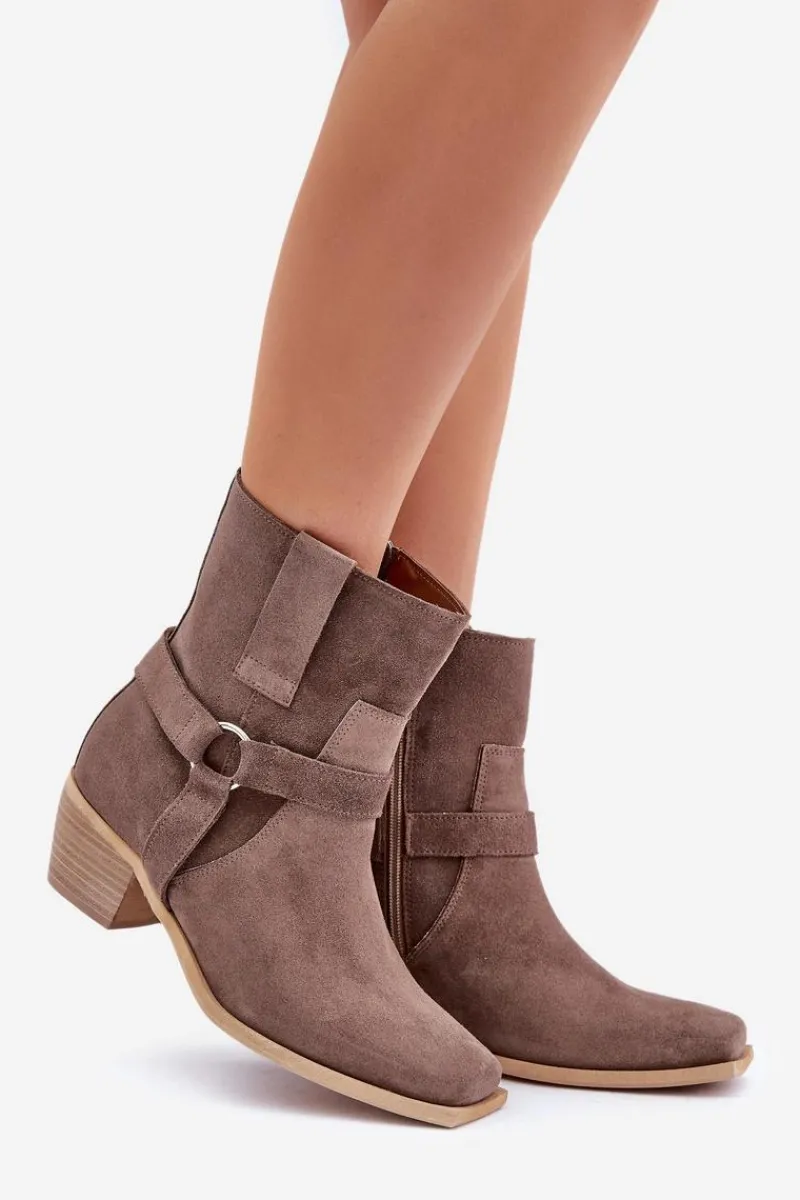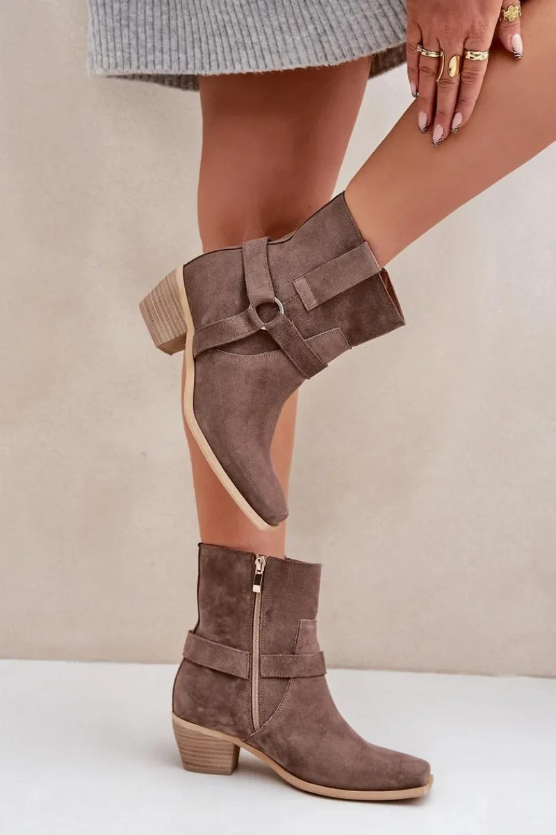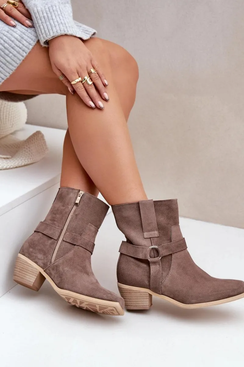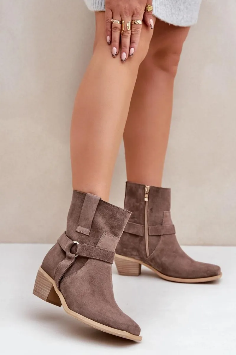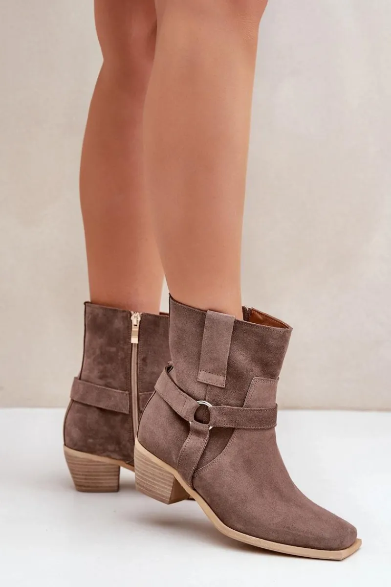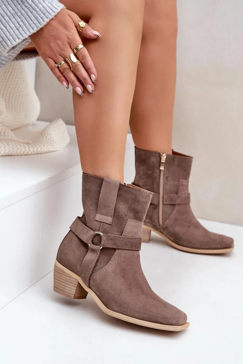 Damskie botki z naturalnego zamszu to stylowy model, idealny na chłodniejsze dni. Osadzone na stabilnym obcasie typu słupek, zapewniają wygodę i subtelnie wydłużają sylwetkę. Zapinane na zamek dla łatwego zakładania, a zaokrąglone noski z kwadratową podeszwą nadają im nowoczesnego charakteru. Cholewkę zdobią paski z ozdobnym elementem, co dodaje elegancji i przyciąga wzrok. Te wyjątkowe botki doskonale sprawdzą się zarówno w casualowych, jak i bardziej formalnych stylizacjach, łącząc wygodę z modnym designem. Przy wyborze rozmiaru prosimy sugerować się tabelą rozmiarów.