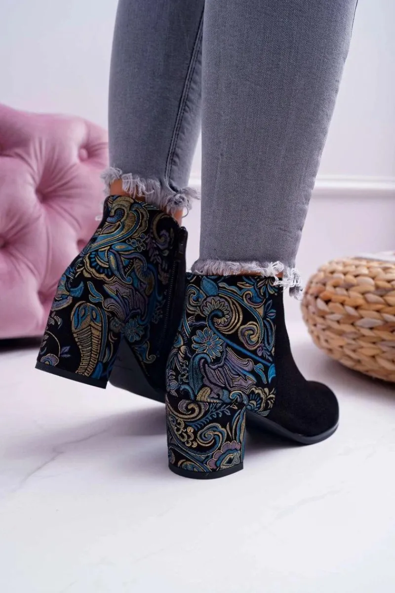 Botki Na Słupku|Czarne Botki>Buty Sergio Leone Botki Damskie Na Słupku Sergio Leone W Kwiaty Folk Czarne Eros2