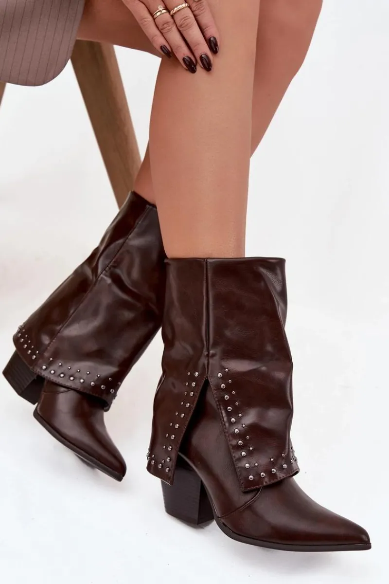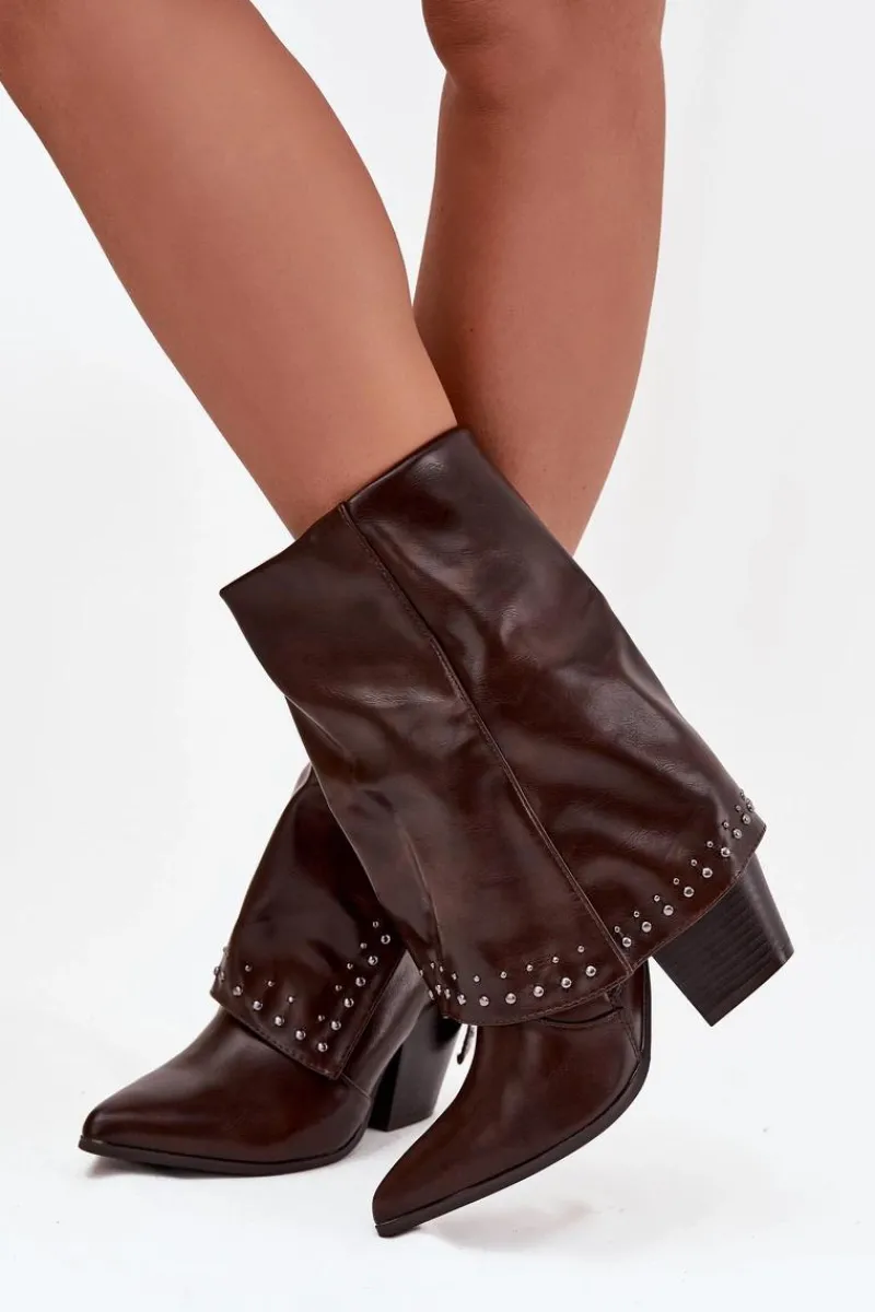 Botki damskie w stylu kowbojek, wykonane z eko skóry to modna propozycja na sezon jesienno-zimowy. Model osadzony został na stabilnym, ściętym obcasie typu słupek, który podkreśla charakter westernowego stylu. Wywinięta cholewka ze zdobieniem nadaje oryginalnego i stylowego wyglądu. Botki są wsuwane, a dodatkowy suwak ułatwia zakładanie i zdejmowanie. Wnętrze ocieplone pianką pokrytą tkaniną zapewnia komfort i ciepło w chłodniejsze dni. To wyjątkowy model, który łączy wygodę z ponadczasowym stylem – idealny zarówno do jeansów, jak i do sukienek w stylu boho.