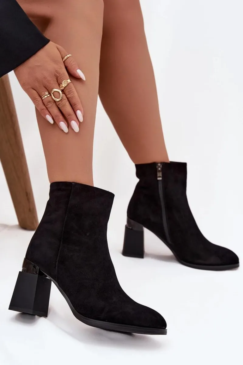Botki damskie z naturalnego zamszu to propozycja, która łączy klasyczną elegancję z codzienną wygodą. Wykonane z wysokiej jakości materiału, prezentują się niezwykle stylowo. Model osadzony na stabilnym obcasie typu słupek pięknie wysmukla sylwetkę, jednocześnie zapewniając komfort noszenia. Buty posiadają praktyczne zapięcie na zamek, które ułatwia zakładanie i zdejmowanie, a delikatnie zaokrąglone noski podkreślają klasyczny wygląd. Ocieplane wnętrze gwarantuje przyjemne ciepło w chłodniejsze dni, dzięki czemu model świetnie sprawdzi się w okresie jesienno-zimowym. To uniwersalne botki, które idealnie dopełnią zarówno eleganckie stylizacje z sukienką, jak i codzienne zestawy z jeansami czy spódnicą.