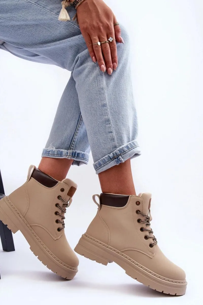 Buty zostały wykonane z miękkiej eko skóry. Osadzone na platformie i płaskim obcasie. Środek został ocieplony kocem obuwniczym. Trapery posiadają przeszycia na cholewce. Wiązanie sprawia, że można je dopasować do własnych potrzeb. Ten model traperów zachwyci każdego! Przy wyborze rozmiaru prosimy sugerować się tabelą rozmiarów.