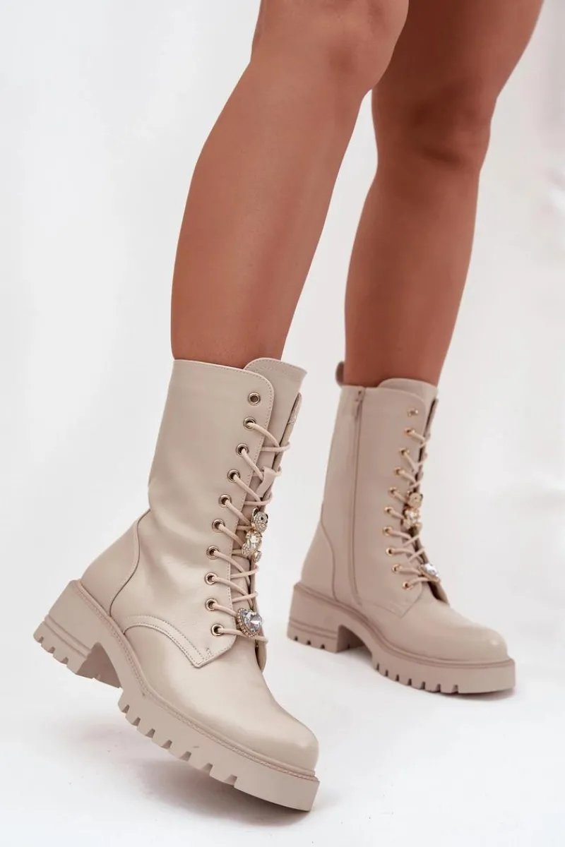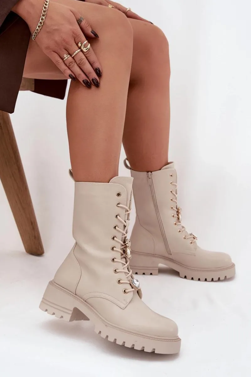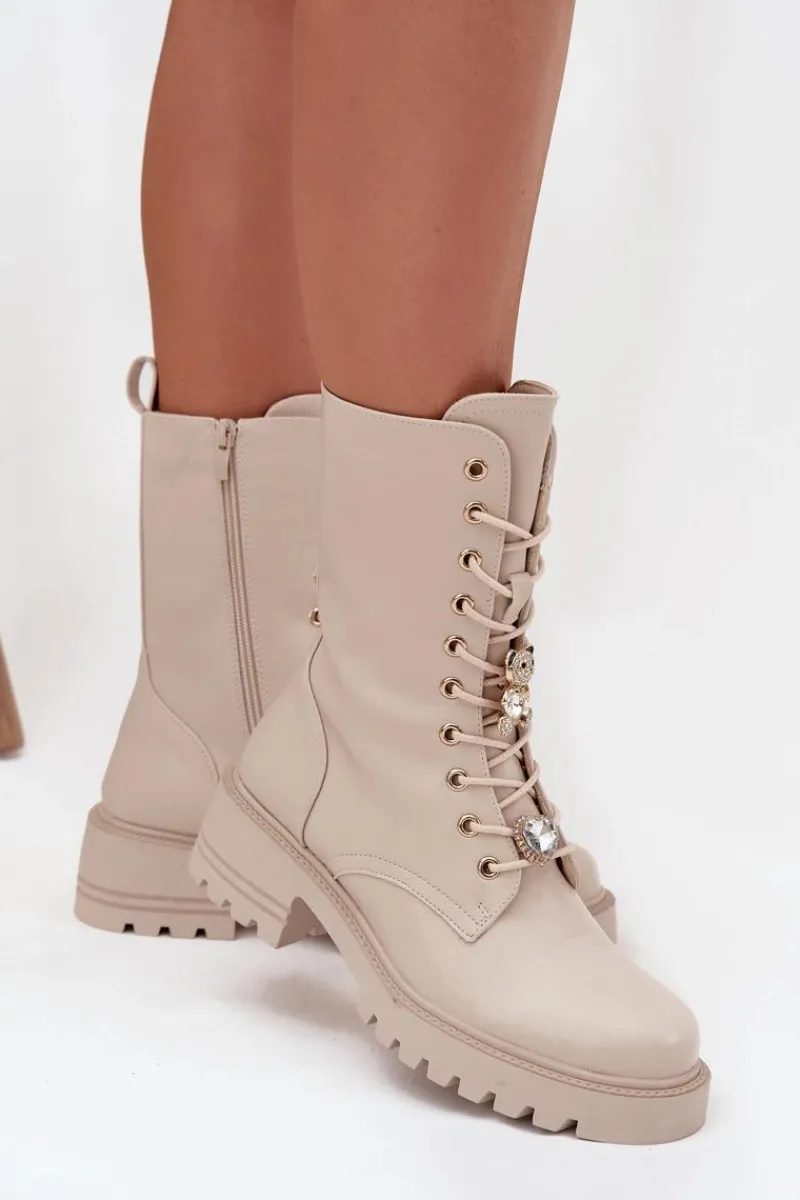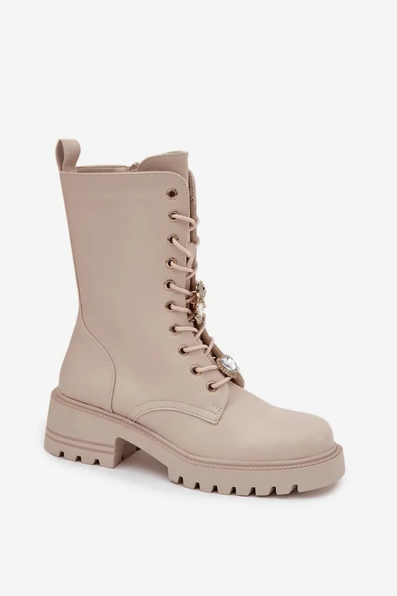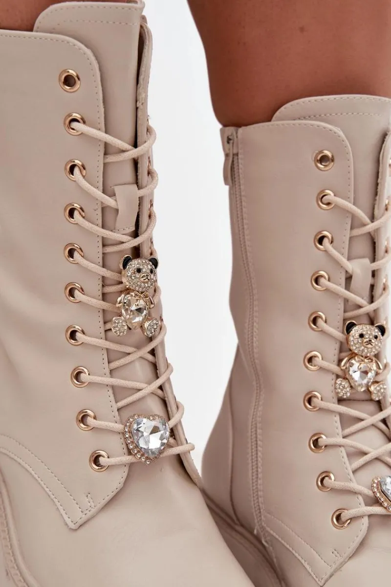 Botki workery damskie wykonane z eko skóry. Model osadzony na stabilnym obcasie typu klocek zapewnia wygodę oraz pewność kroku. Buty są sznurowane i zapinane na zamek, co ułatwia ich zakładanie i pozwala idealnie dopasować je do stopy. Ozdobne przypinki w formie misia i serduszka umieszczone przy sznurowaniu nadają im oryginalnego, modnego charakteru. To doskonała propozycja dla kobiet, które lubią łączyć wygodę z niebanalnym stylem – idealne do codziennych, miejskich stylizacji. Przy wyborze rozmiaru prosimy sugerować się tabelą rozmiarów.