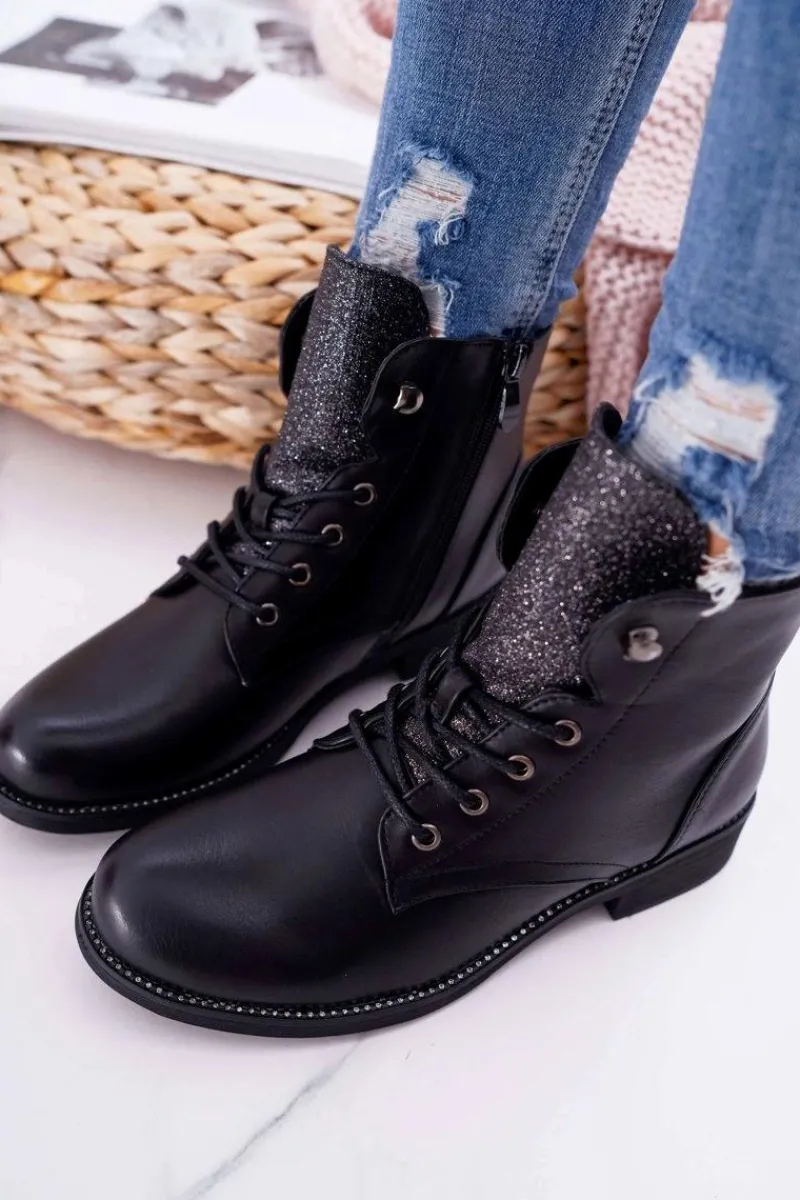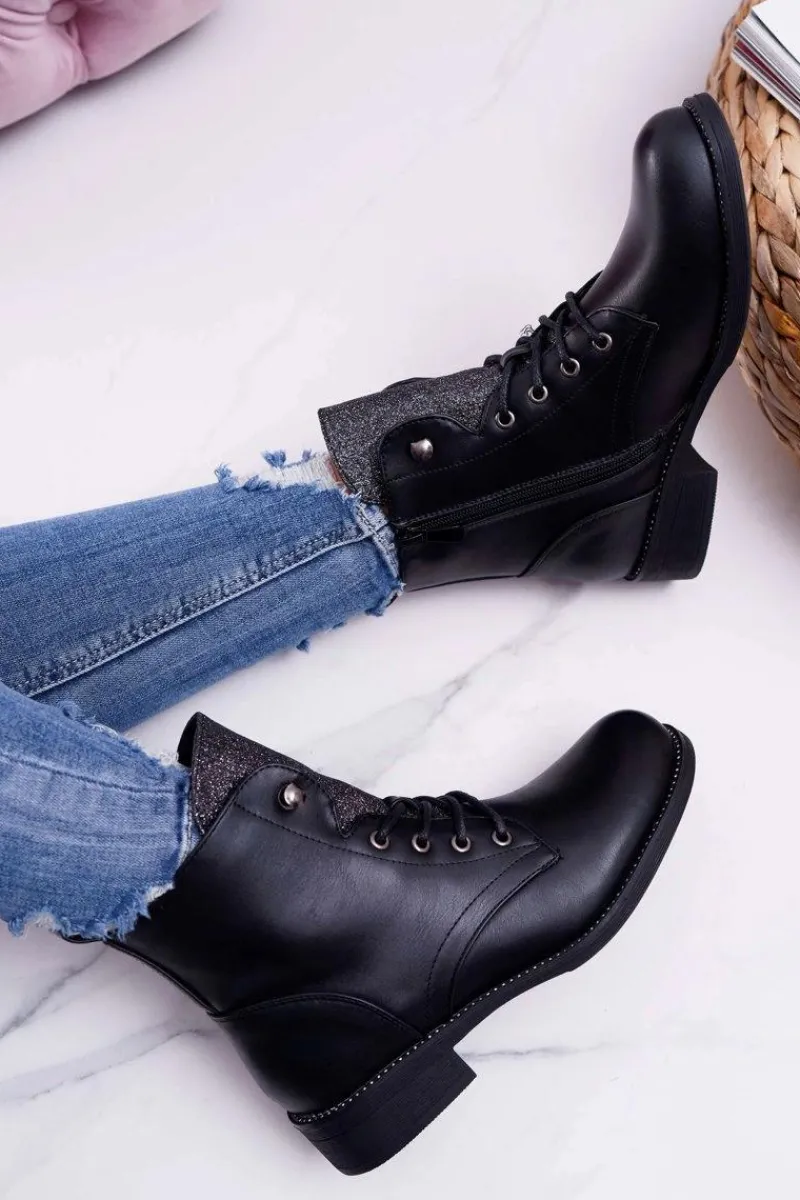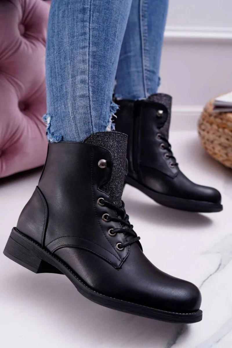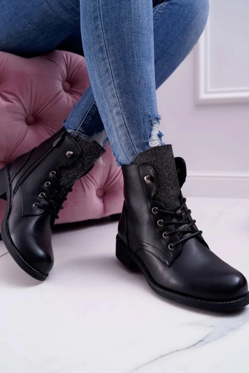 Botki Sznurowane|Botki Płaskie>Boto Damskie Botki Workery Płaski Obcas Czarne Flumen