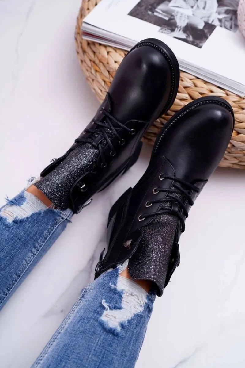 Niezwykle wygodne i modne botki na płaskim obcasie. Klasyczny wzór zdobiony brokatem na języku oraz cyrkoniami wokół podeszwy. Suwak na wewnętrznej stronie ułatwi zakładanie. Przy wyborze rozmiaru prosimy sugerować się tabelą rozmiarów.