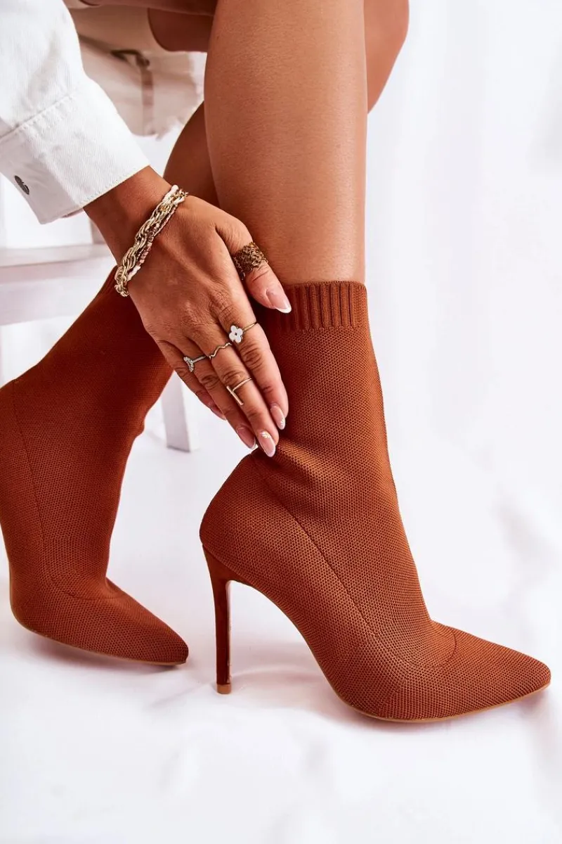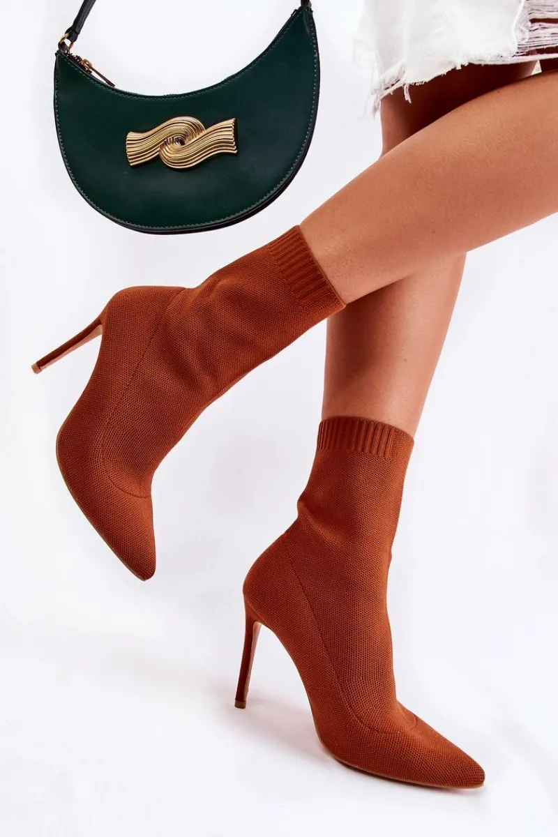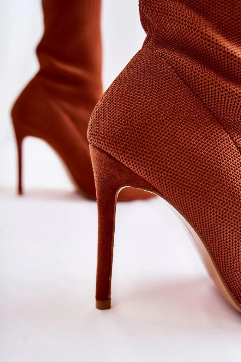 Botki Wiosenne|Botki Na Obcasie>Boto Damskie Wysokie Botki Ze Skarpetą Na Szpilce Camel Luisell Brązowy