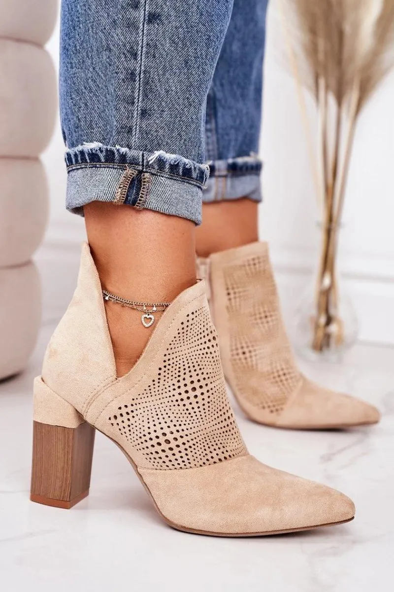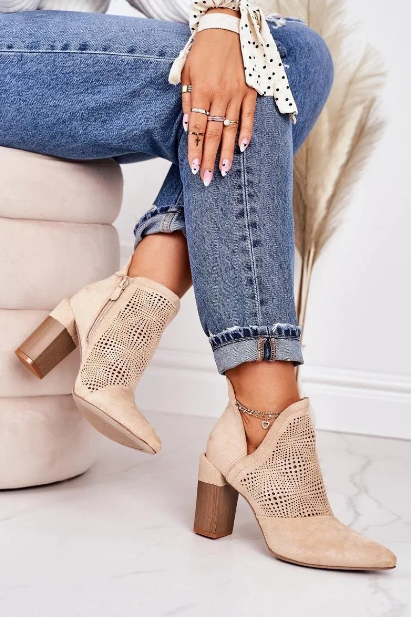 Wiosenne ażurowe botki na słupku. Buty wykonane są z eko zamszu. Botki są bardzo wygodne dzięki miękkiej wkładce oraz stabilnemu słupkowi. Koniecznie sprawdź całą naszą kolekcję damskich botków! Przy wyborze rozmiaru prosimy sugerować się tabelą rozmiarów.