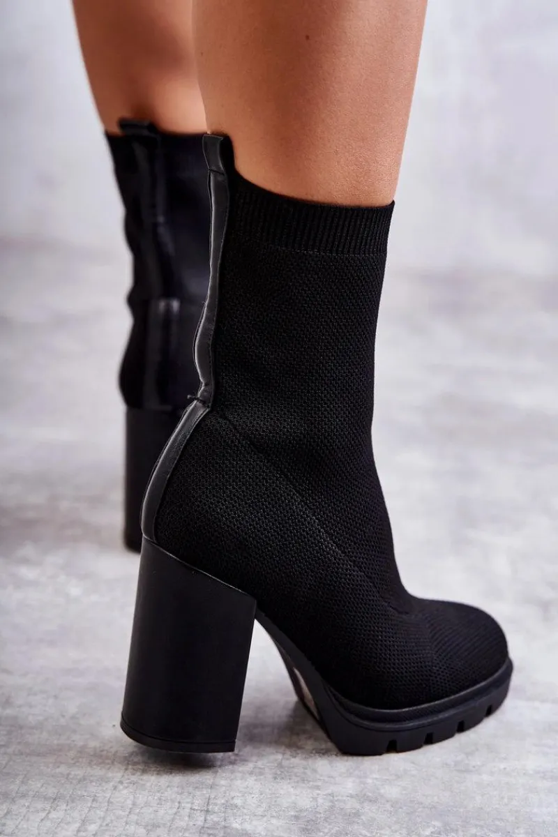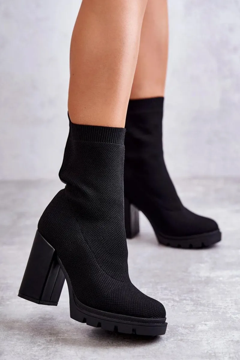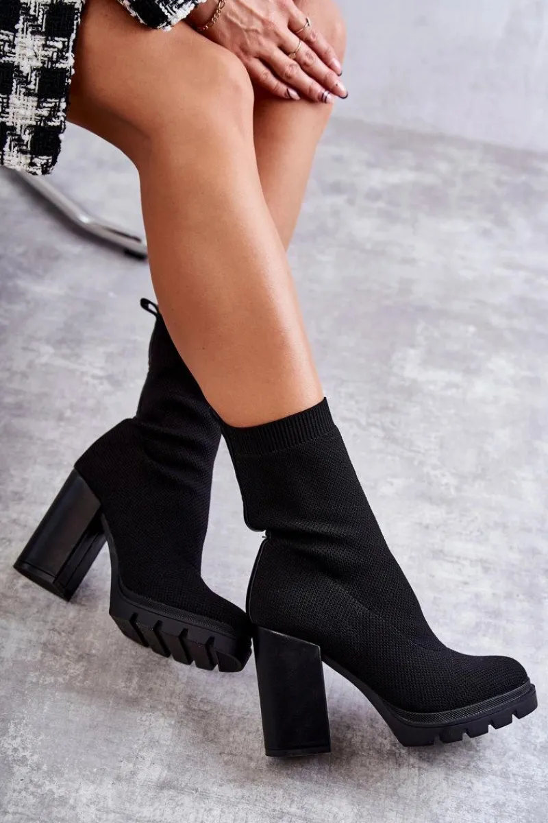 Modne botki z elastyczną cholewką za kostkę wykonaną z materiału. Na wysokości stopy są ocieplane kocem obuwniczym. Osadzone na obcasie w postaci masywnego słupka oraz platformie ze żłobieniami. Zapiętek jest usztywniany. Model ten świetnie będzie prezentować się zarówno z sukienkami, jak i jeansami. Dodatkowo buty posiadają bootstrapa, czyli pętelkę ułatwiającą zakładanie i ściąganie obuwia. Przy wyborze rozmiaru prosimy sugerować się tabelą rozmiarów.