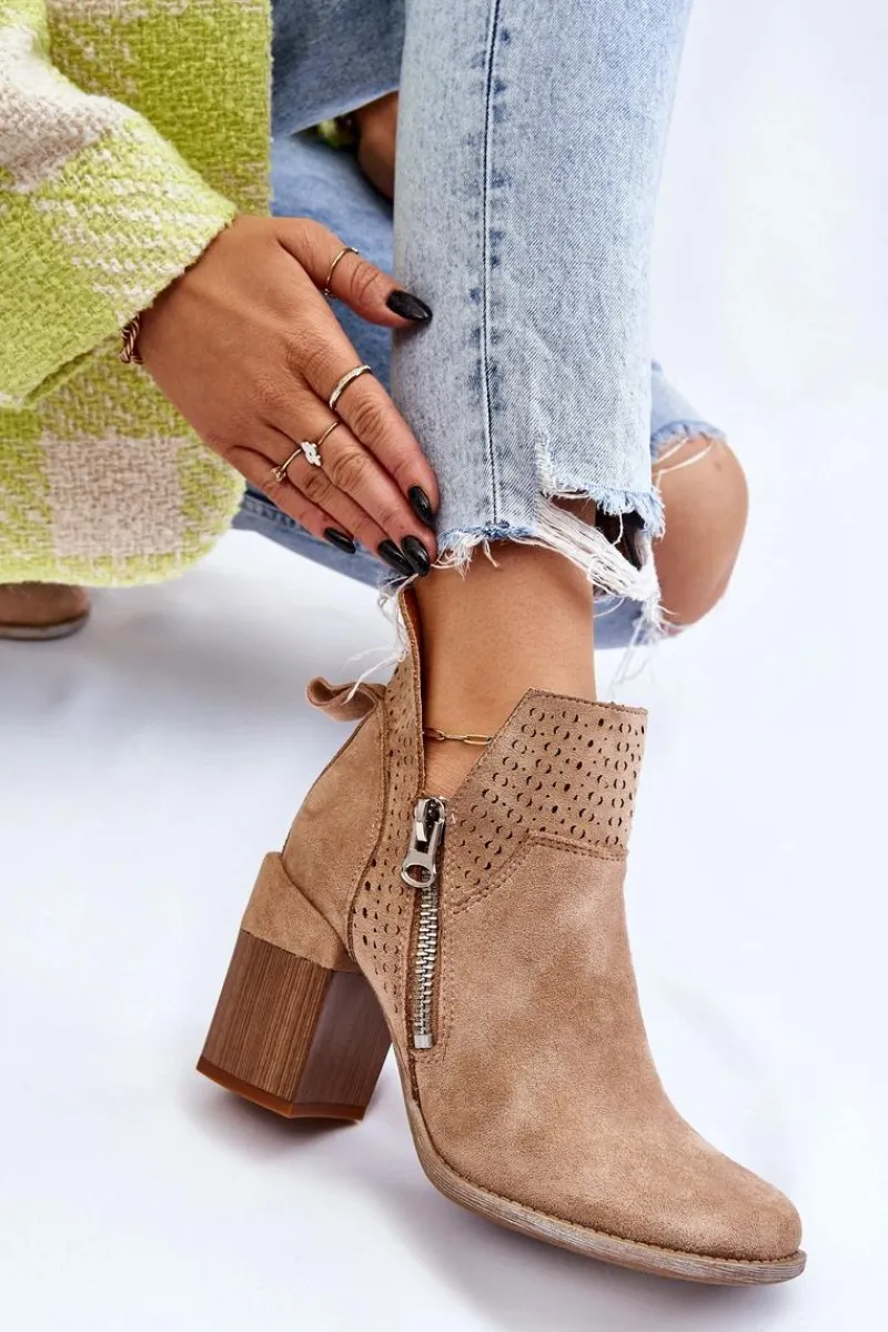 Modne botki na masywnym obcasie w postaci klocka zostały wykonane z eko zamszu z wycięciami po bokach cholewki. Dodatkowo zostały ozdobione ażurowym wzorkiem. Model ten posiada dodatkowy suwak z boku cholewki. Zapiętek w tych botkach jest usztywniany. Miękka i wygodna wkładka została wykonana z eko skóry. Powinnaś mieć ten model w swojej szafie! Przy wyborze rozmiaru prosimy sugerować się tabelą rozmiarów.