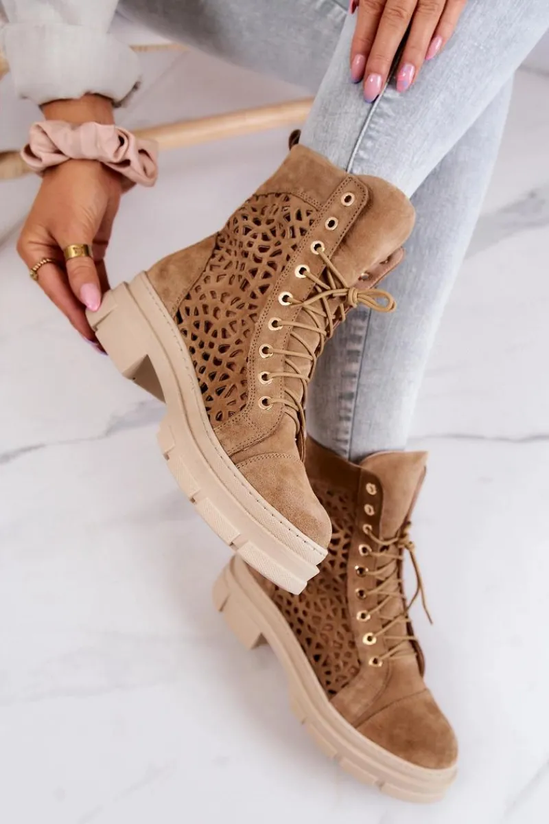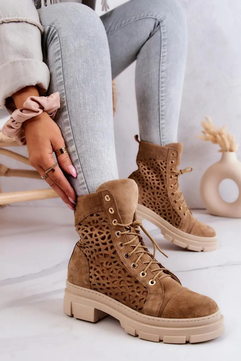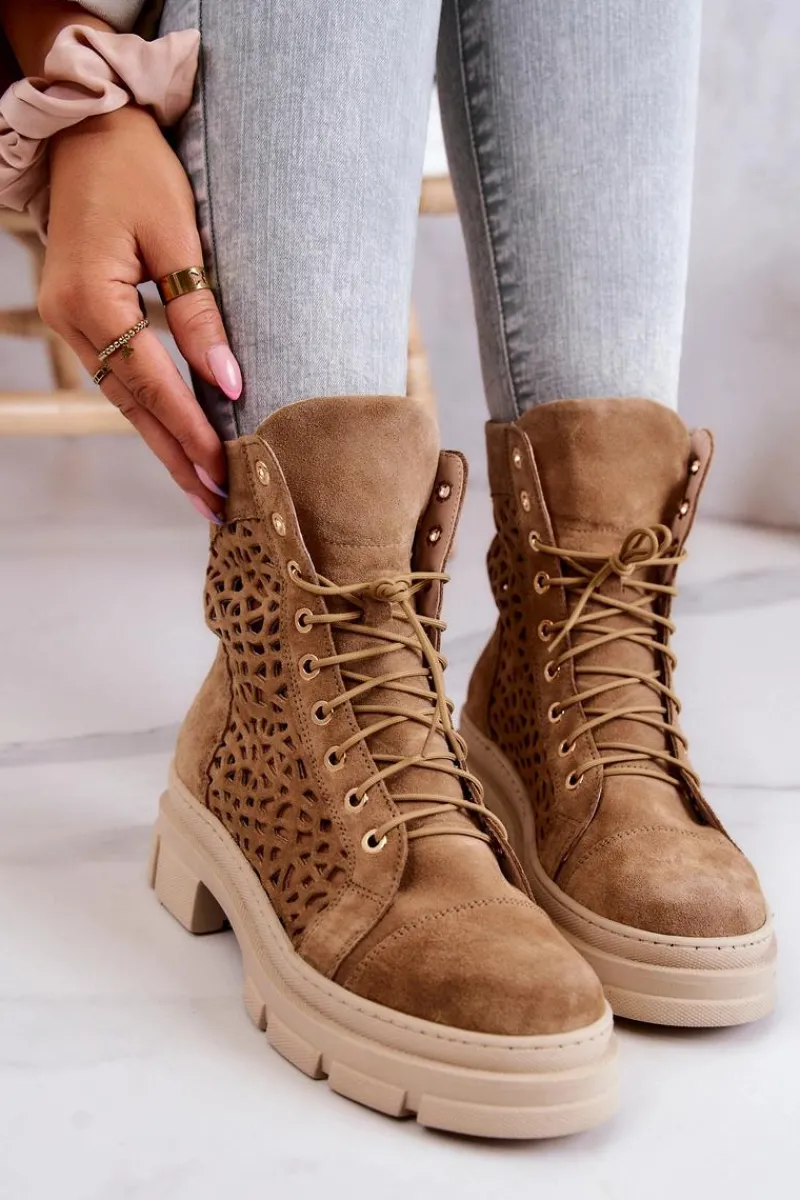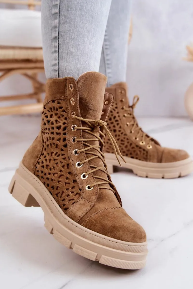Świetne, ażurowe botki zostały wykonane z naturalnej, zamszowej skóry z dbałością o każdy detal. Skórzana wkładka oraz wygodny, płaski obcas zadbają o Twój komfort. Botki dopełnią wiele stylizacji. Posiadają klasyczne wiązanie. Powinnaś uzupełnić swoją garderobę właśnie o ten model botków, dlatego nie czekaj dłużej i kup już teraz ! Przy wyborze rozmiaru prosimy sugerować się tabelą rozmiarów.