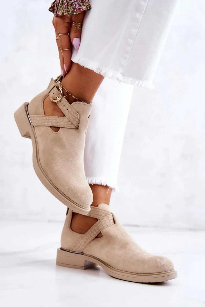 Cudne botki wykonane z naturalnej zamszowej skóry. Wkładka wykonana z naturalnej skóry, co sprawia, że są bardzo komfortowe podczas użytkowania. Z boku cholewki znajdują się wycięcia oraz regulowany pasek zapinany na sprzączkę. Plaski obcas zapewnia stabilizację. Tłoczona faktura oraz modny fason sprawiają, że te buty wyglądają naprawdę wyjątkowo. Nosek w kształcie migdała. Antypoślizgowa podeszwa. Koniecznie sprawdź także pozostałe modele skórzanych butów dostępnych w naszej ofercie! Przy wyborze rozmiaru prosimy sugerować się tabelą rozmiarów.