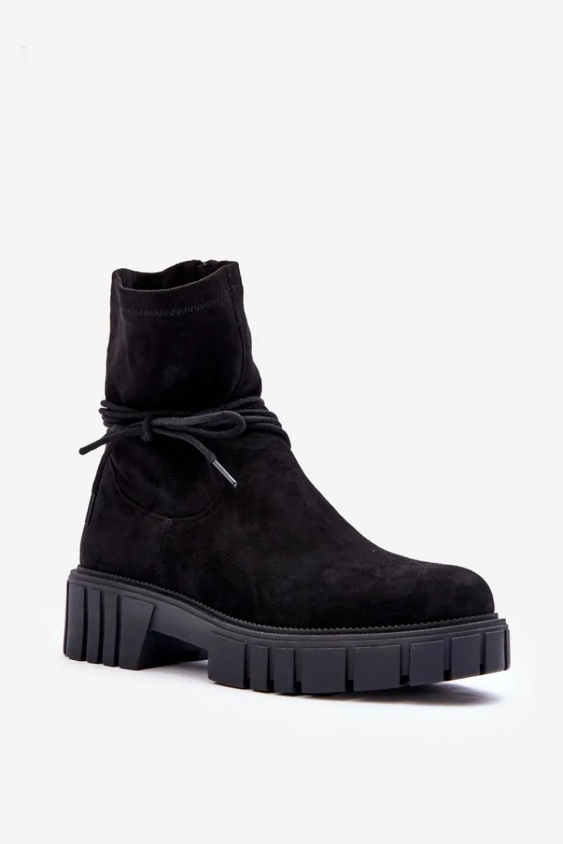 Klasyczne botki damskie zostały wykonane z miłego w dotyku eko zamszu. Zapinane są z boku cholewki na suwak. Cholewka wzbogacona została wiązaniem. Botki posiadają usztywniany zapiętek. Osadzone na platformie oraz masywnym, płaskim obcasie. Przy wyborze rozmiaru prosimy sugerować się tabelą rozmiarów.