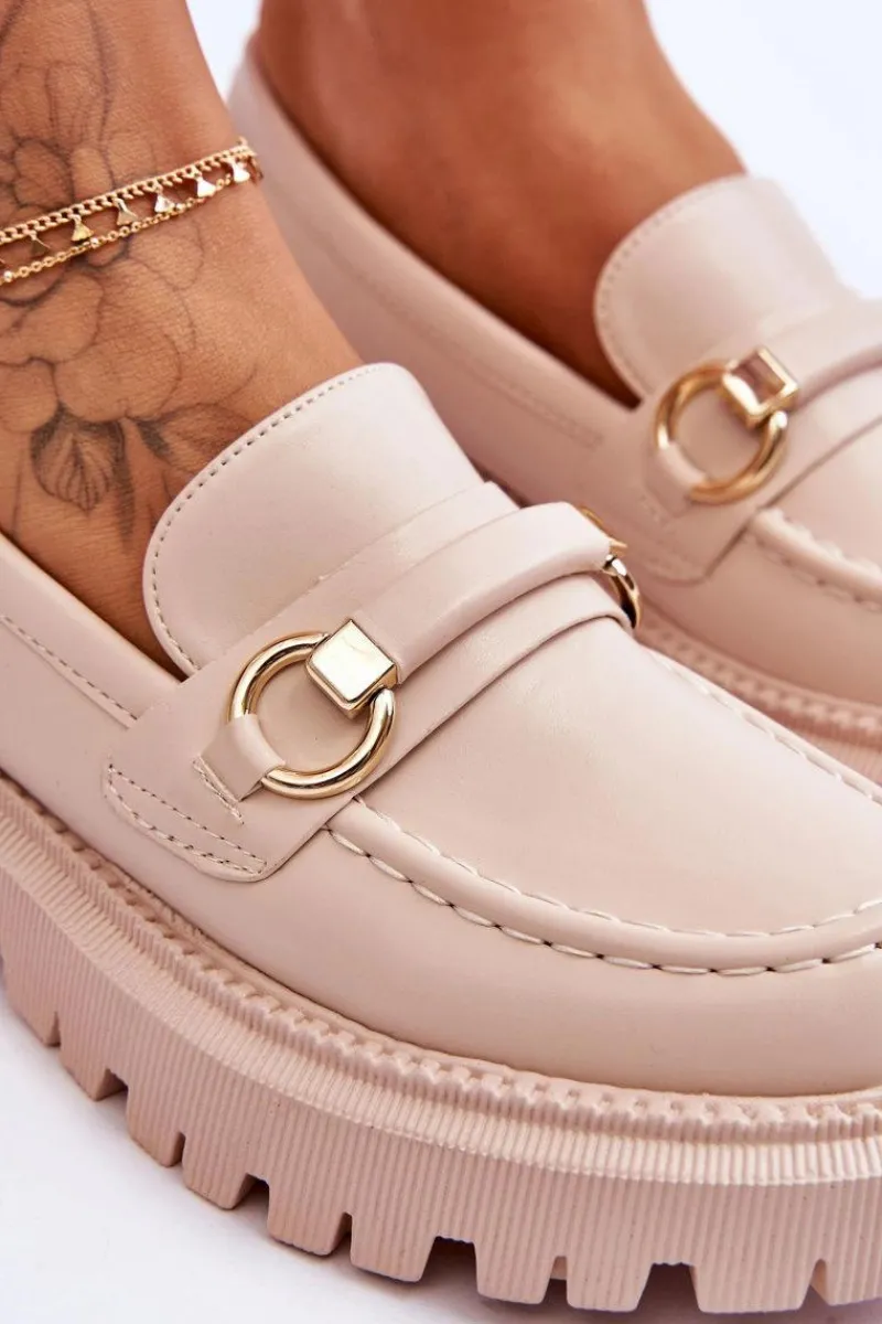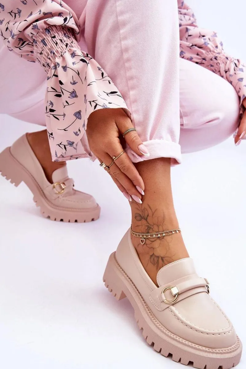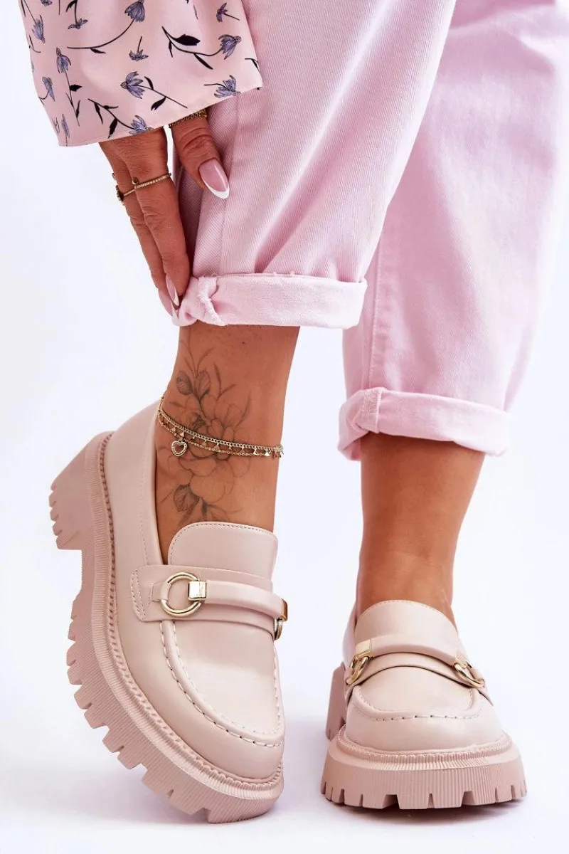 Damskie mokasyny osadzone na masywnej platformie i płaskim obcasie świetnie wpasują się w wiele stylizacji! To obuwie jest idealne na wiele sezonów! Mokasyny zostały wykonane z eko skóry. Posiadają delikatnie usztywniany zapiętek. Na pasku znajduje się ozdoba. Mokasyny posiadają także eko skórzaną wkładkę. Przy wyborze rozmiaru prosimy sugerować się tabelą rozmiarów.