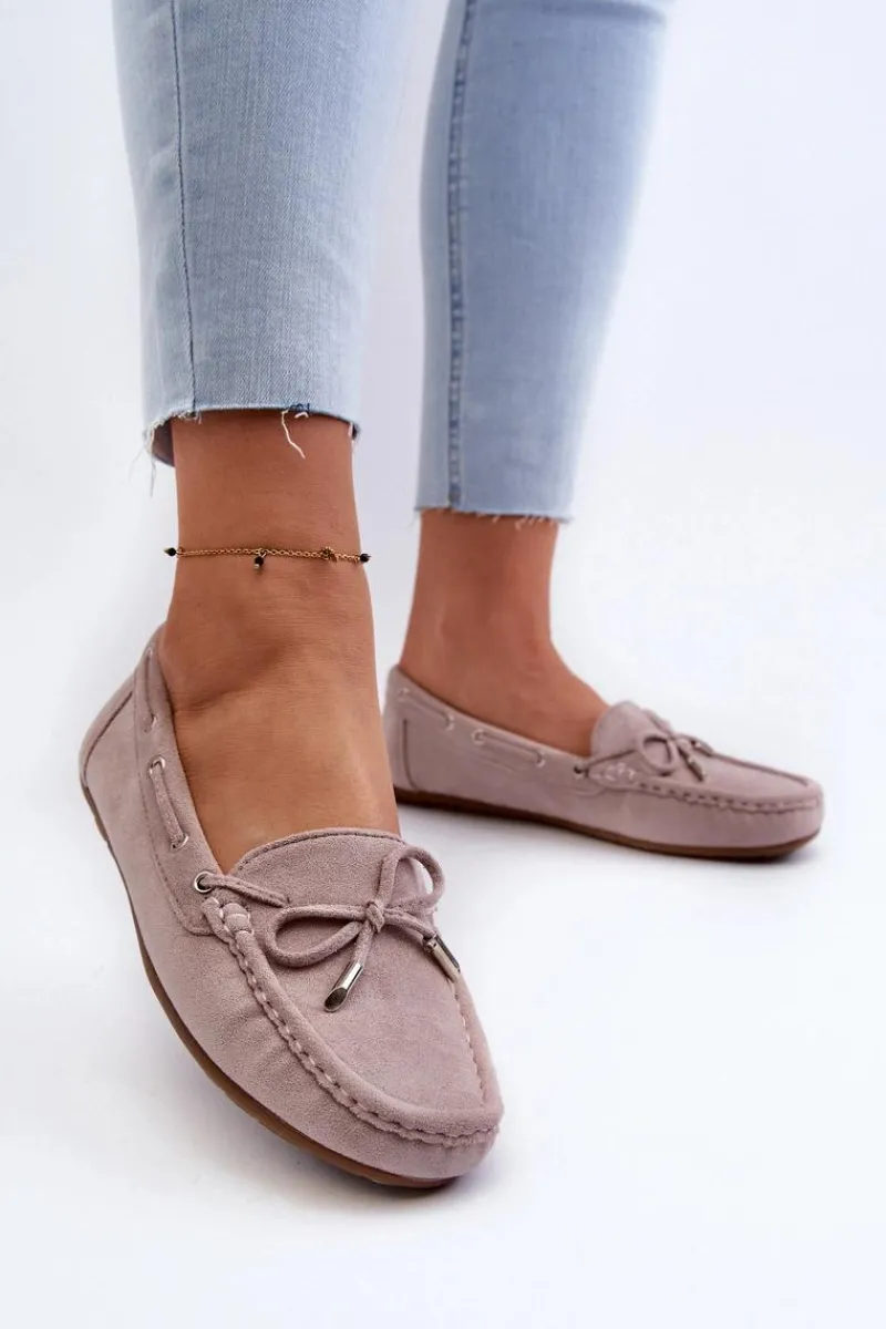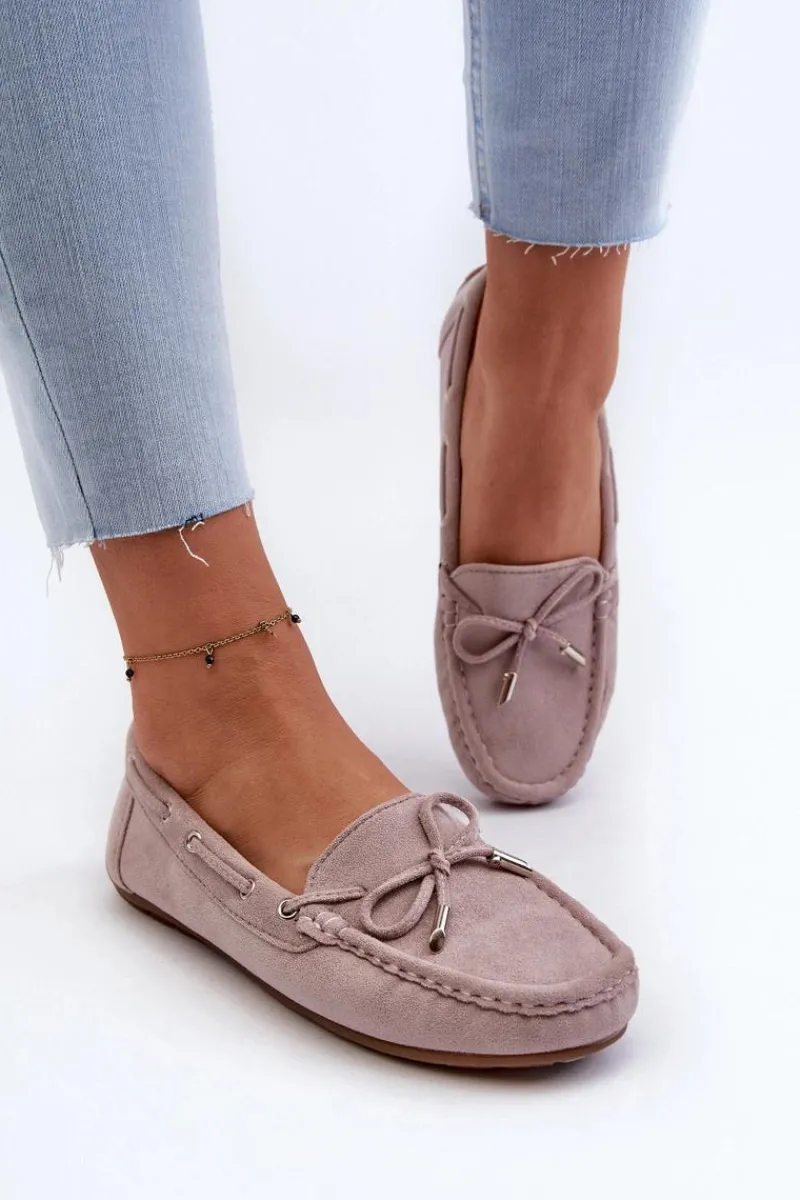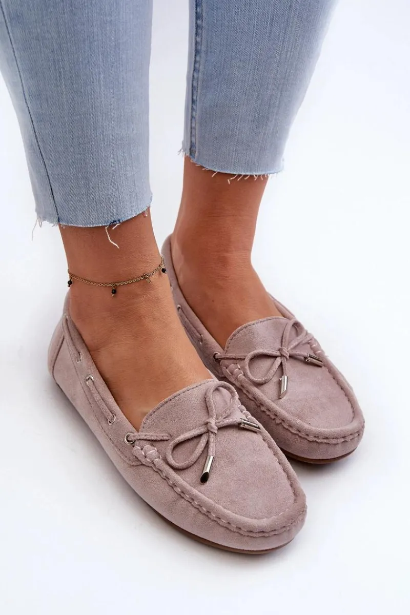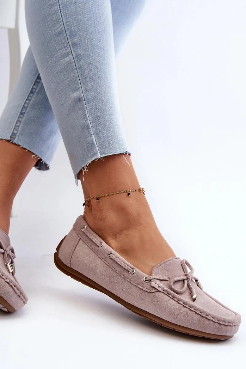 Damskie, klasyczne mokasyny zostały wykonane z eko zamszu. Model ten posiada na przodzie ozdobną kokardkę oraz przeplatające się przez boki cholewki sznureczki. Mokasyny osadzono na antypoślizgowej podeszwie. Miękka wkładka z eko skóry zapewni komfort podczas użytkowania obuwia. Dodatkowo jest delikatnie perforowana. Koniecznie powinnaś je mieć w swojej kolekcji obuwia! Przy wyborze rozmiaru prosimy sugerować się tabelą rozmiarów.