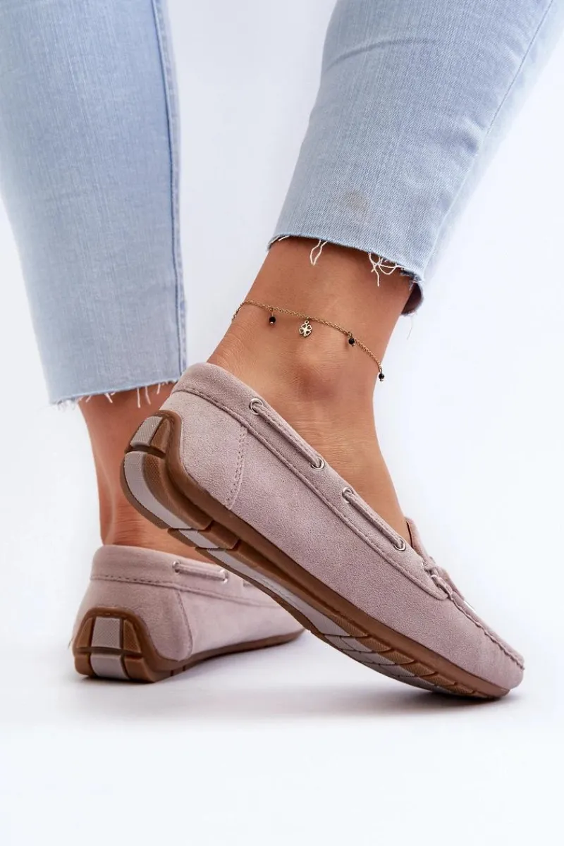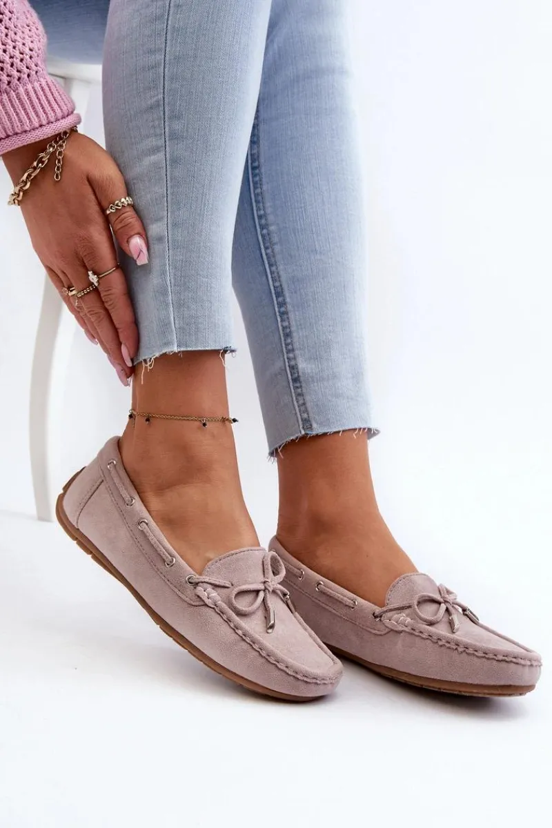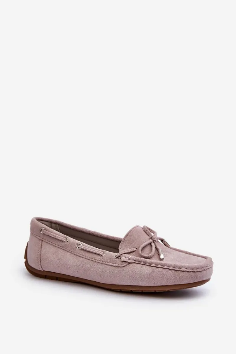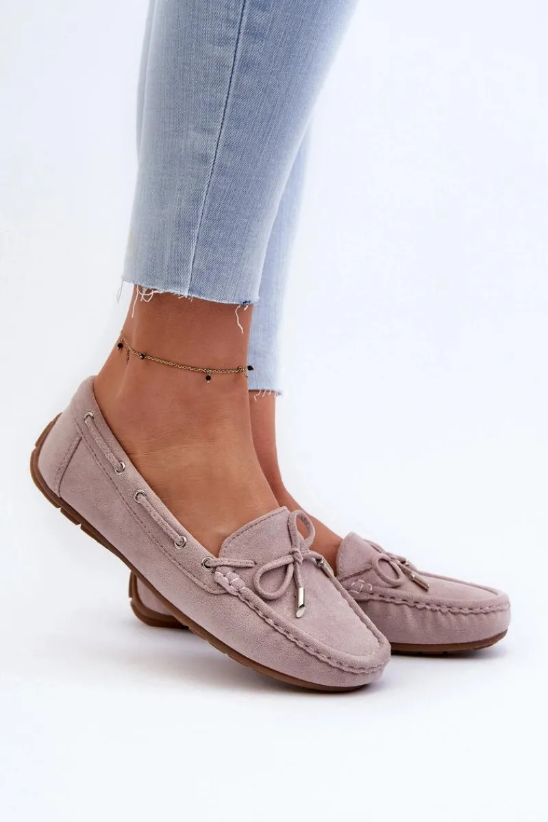 Damskie, klasyczne mokasyny zostały wykonane z eko zamszu. Model ten posiada na przodzie ozdobną kokardkę oraz przeplatające się przez boki cholewki sznureczki. Mokasyny osadzono na antypoślizgowej podeszwie. Miękka wkładka z eko skóry zapewni komfort podczas użytkowania obuwia. Dodatkowo jest delikatnie perforowana. Koniecznie powinnaś je mieć w swojej kolekcji obuwia! Przy wyborze rozmiaru prosimy sugerować się tabelą rozmiarów.