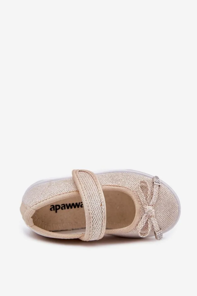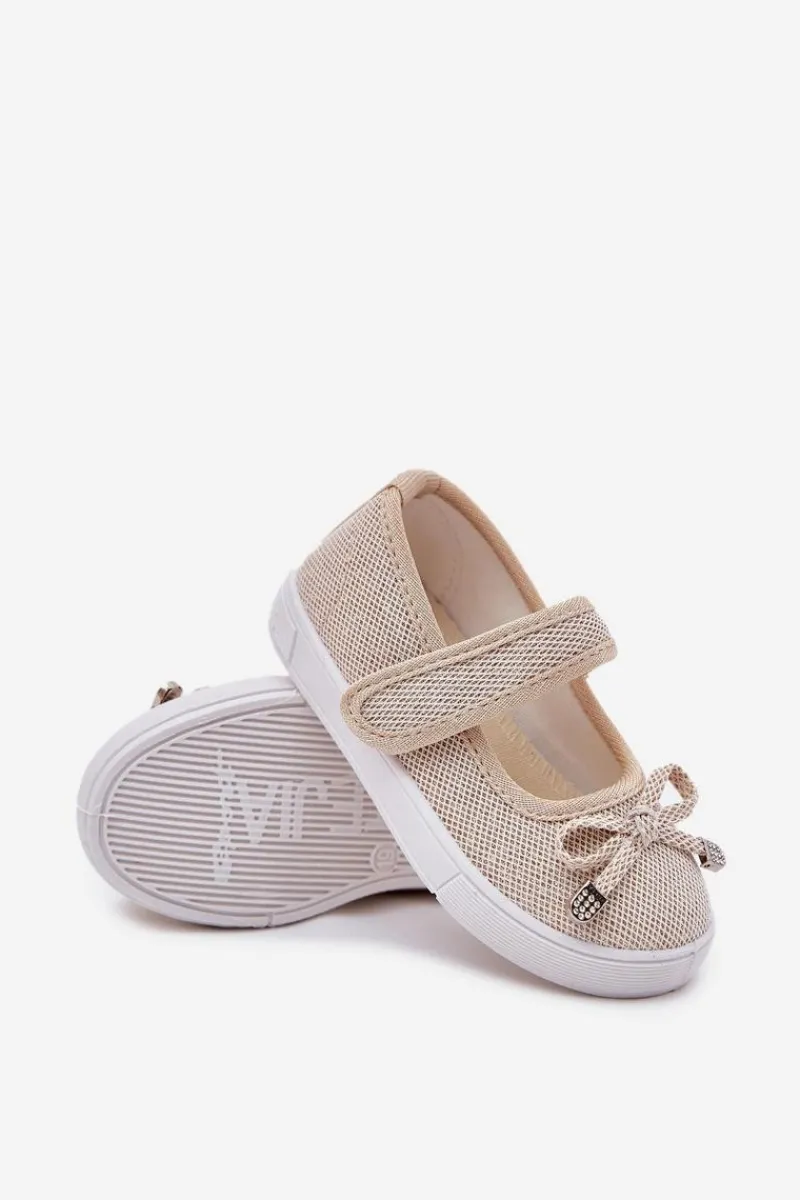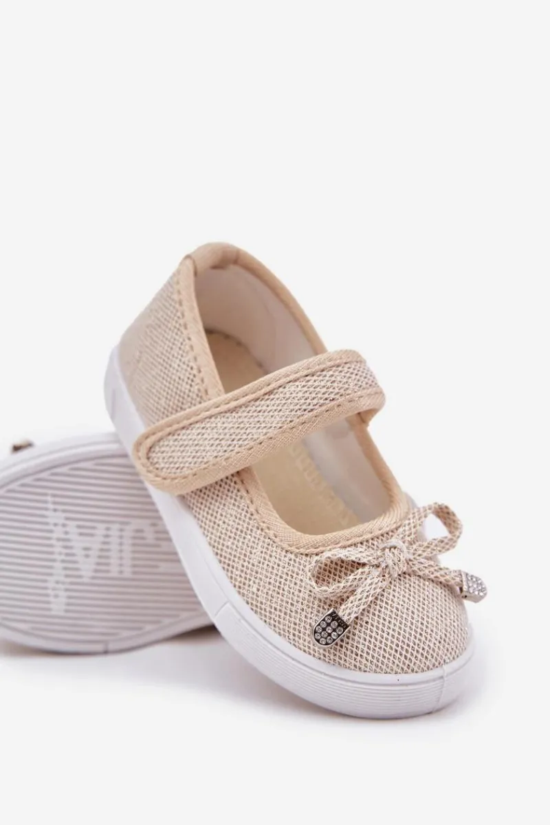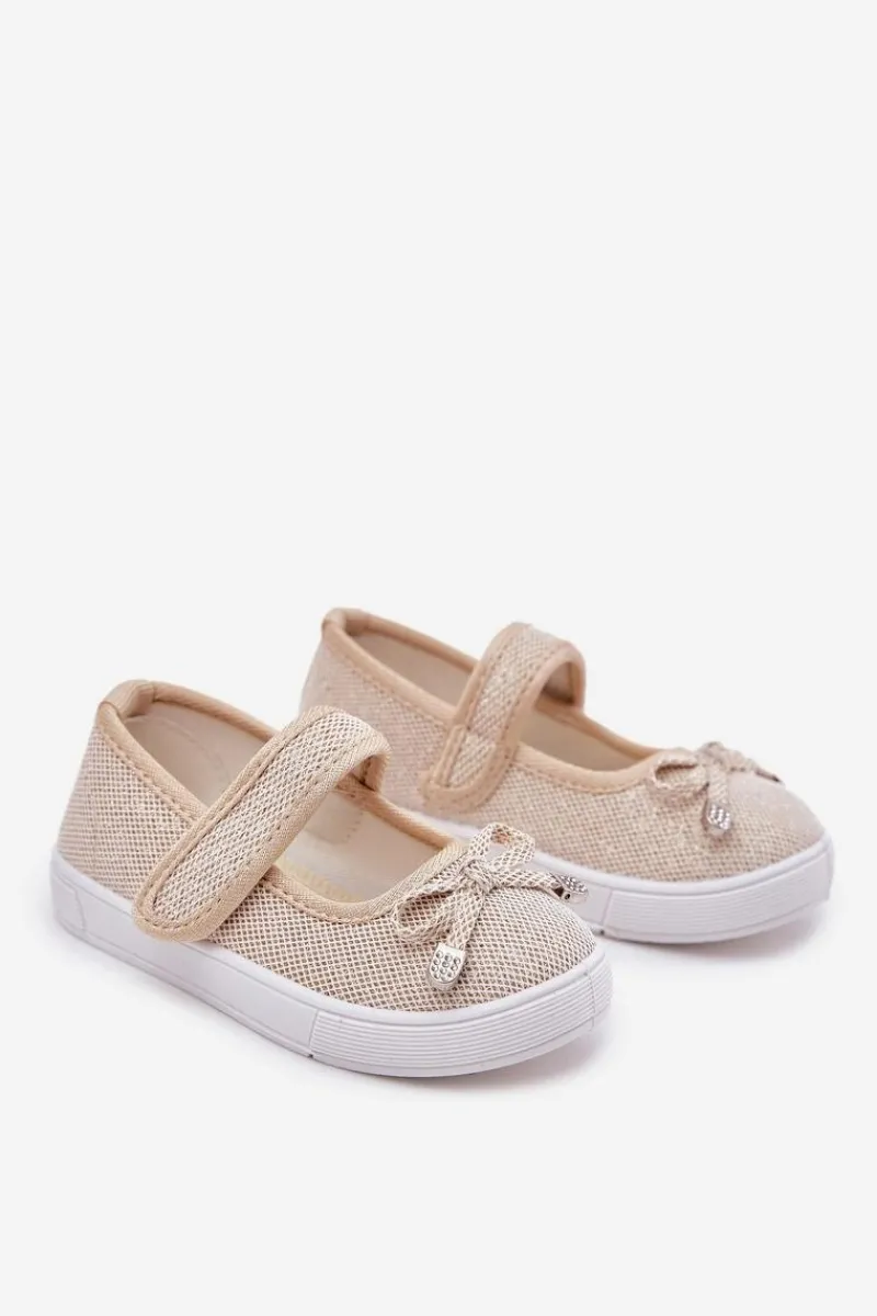 Dziecięce balerinki wykonane z materiału tekstylnego. Dzięki elastycznej podeszwie maluchy mogą swobodnie biegać i bawić się przez cały dzień. Model zapinany na rzep ułatwia zakładanie i zdejmowanie butów, a urocza kokardka z przodu dodaje im dziewczęcego uroku. Zaokrąglone noski i materiałowa wkładka gwarantują komfort i odpowiednią wentylację stóp, czyniąc te balerinki idealnym wyborem na co dzień. Przy wyborze rozmiaru prosimy sugerować się tabelą rozmiarów.