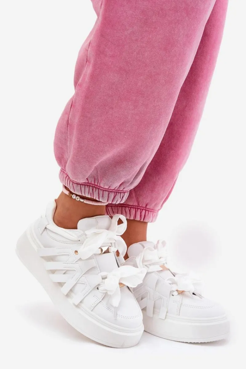 Damskie sneakersy zostały wykonane ze skóry ekologicznej. Charakteryzują się solidnym sznurowaniem, które pozwala na idealne dopasowanie butów do szerokości stopy. Buty te są osadzone na platformie. Wkładka z pianki zapewnia komfort i wygodę podczas noszenia. Ten nowoczesny model doskonale uzupełni wiele kreacji, nadając im sportowy charakter! Przy wyborze rozmiaru prosimy kierować tabelą rozmiarów.