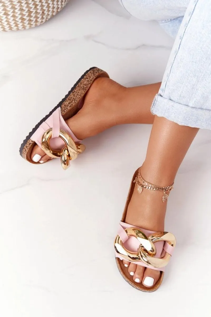 Wyjątkowe klapki damskie wykonane z eko skóry. Buty posiadają profilowaną wkładkę, która zagwarantuje komfort. Modny fason z masywnym łańcuchem urozmaici Twoje stylizacje! Przy wyborze rozmiaru prosimy sugerować się tabelą rozmiarów.