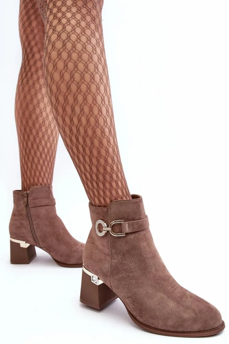 Rewelacyjne, damskie botki zostały osadzone na zdobionym obcasie w postaci słupka. Model ten został wykonany z eko zamszu. Na cholewce z boku umieszczono ozdobę z dżetami, natomiast z drugiej strony suwak ułatwiający zakładanie obuwia. Środek tego botka nie jest ocieplony. Usztywniony zapiętek zapewni stabilizację. Przy wyborze rozmiaru prosimy sugerować się tabelą rozmiarów.