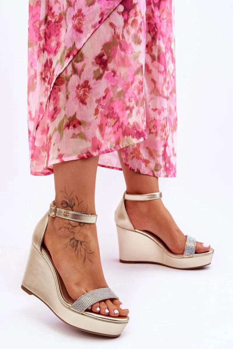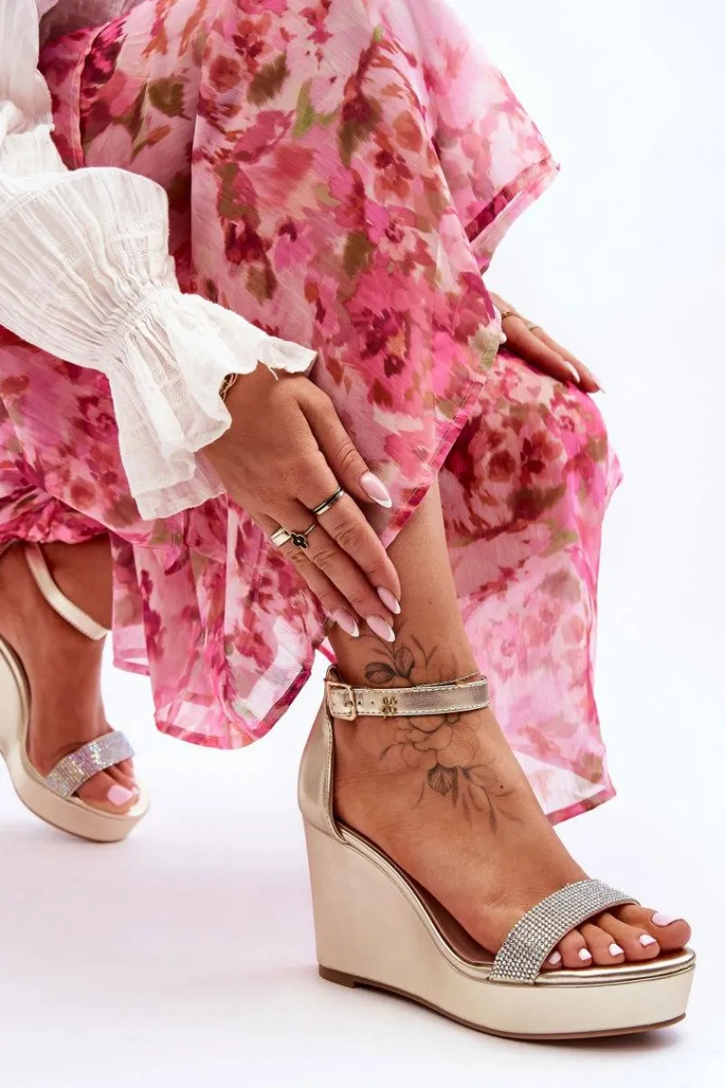Cudowne, damskie sandały zostały wykonane z eko skóry. Posiadają zdobienia w postaci dżetów imitujących cyrkonie. Miękka wkładka z perforacją zapewni komfortowe użytkowanie obuwia. Dodatkowo zapiętek w tych butach jest usztywniany. Sandałki osadzono na platformie i koturnie. Model ten jest zapinany na regulowany pasek ze sprzączką. Przy wyborze rozmiaru prosimy sugerować się tabelą rozmiarów.