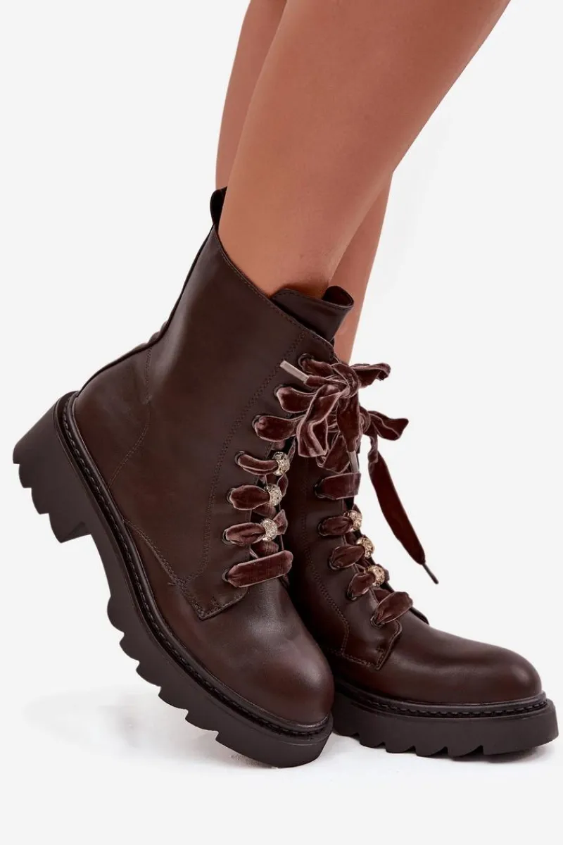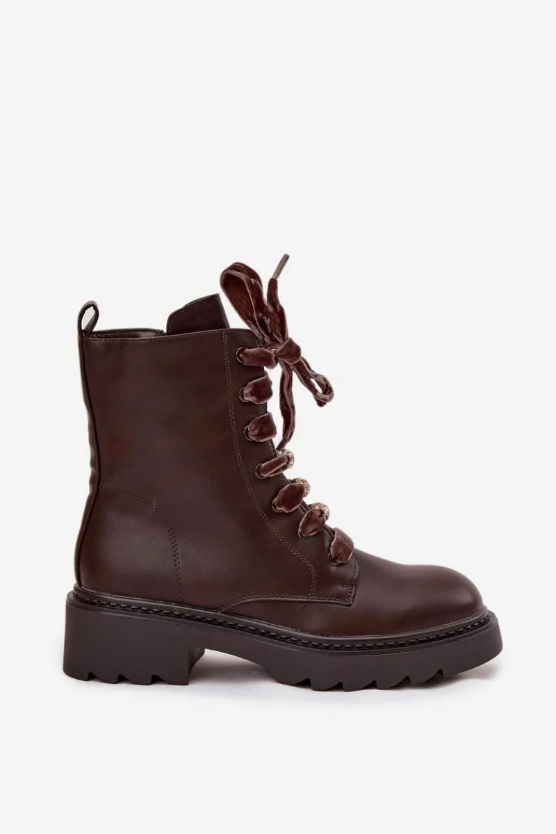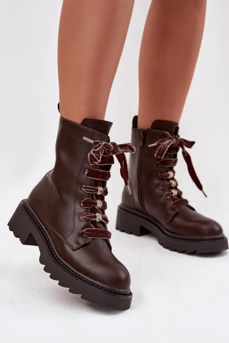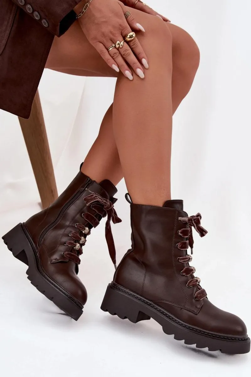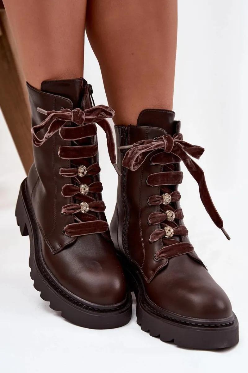 Botki damskie wykonane z eko skóry to propozycja, która łączy elegancję z nowoczesnym stylem. Wnętrze ocieplane miękkim kocem obuwniczym zapewnia ciepło i wygodę w chłodniejsze dni. Model wyróżnia się efektownym sznurowaniem z aksamitnego materiału, które wyjątkowego uroku. Całość dopełniają ozdobne przypinki, dodające modnego akcentu. To stylowe botki idealne do jesienno-zimowych stylizacji.Przy wyborze rozmiaru prosimy sugerować się tabelą rozmiarów.