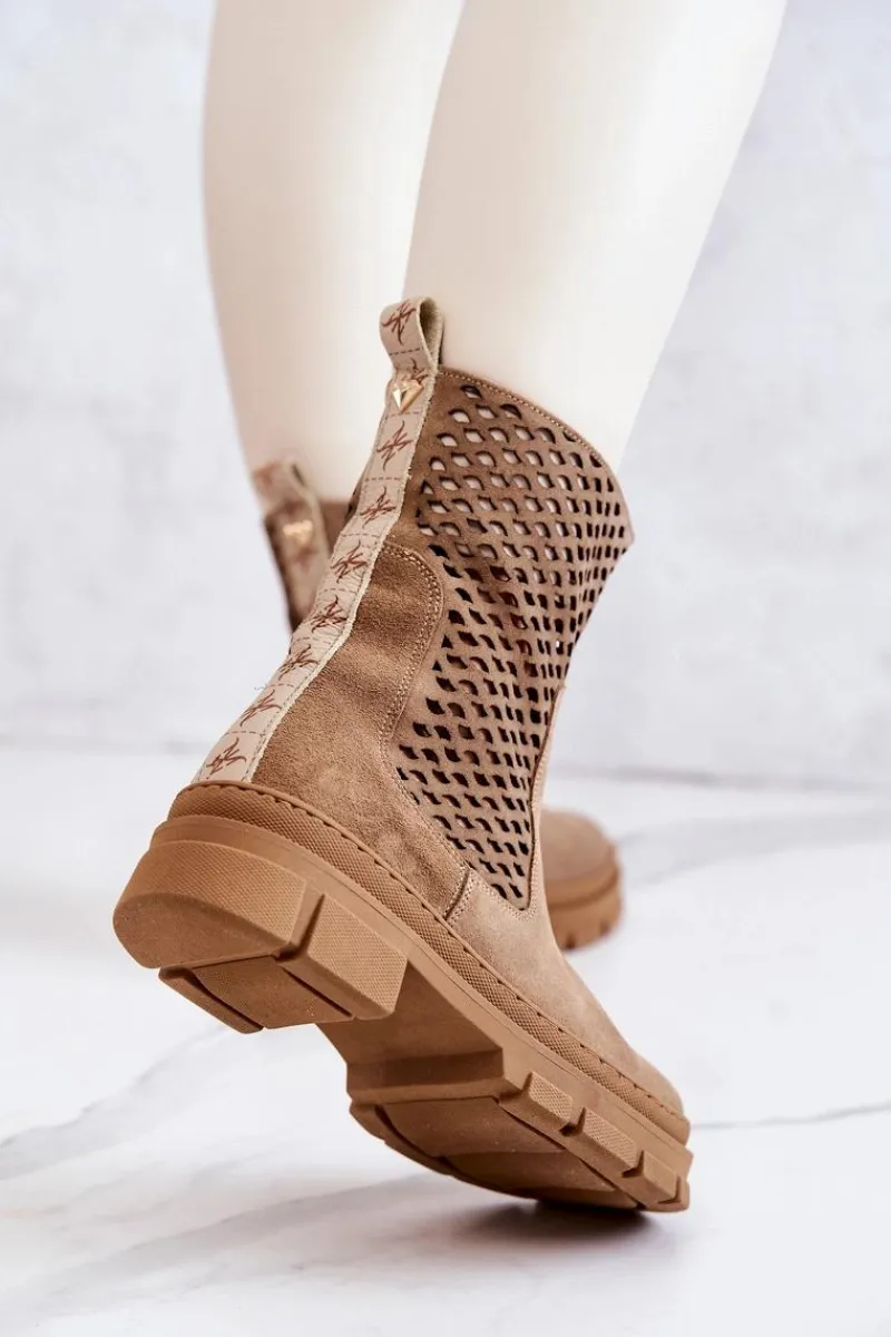 Damskie botki firmy Nicole zostały wykonane w całości ze skóry naturalnej. Przyjemny i wygodny zamsz zapewni wyjątkowy komfort. Zapinane na zamek błyskawiczny. Antypoślizgowa podeszwa w stylu workerów zapewni stabilność na każdym kroku. Cholewka posiada ażurowy wzór. Koniecznie sprawdź pozostałe nasze modele marki Nicole! Przy wyborze rozmiaru prosimy sugerować się tabelą rozmiarów.
