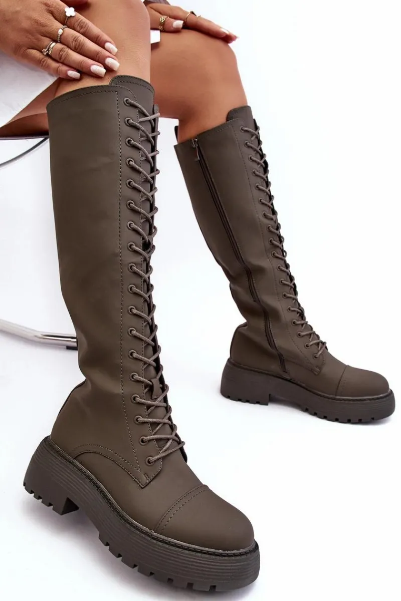 Damskie kozaki — glany posiadają sznurowanie oraz suwak na całości cholewki. Wykonane z eko skóry. Cholewka przed kolano. Środek ocieplony kocem obuwniczym. Model ten osadzony jest na płaskim obcasie i platformie. Przy wyborze rozmiaru prosimy kierować tabelą rozmiarów.