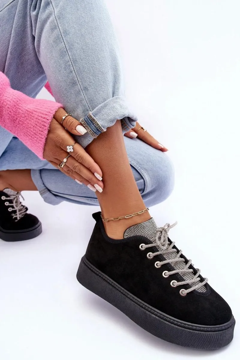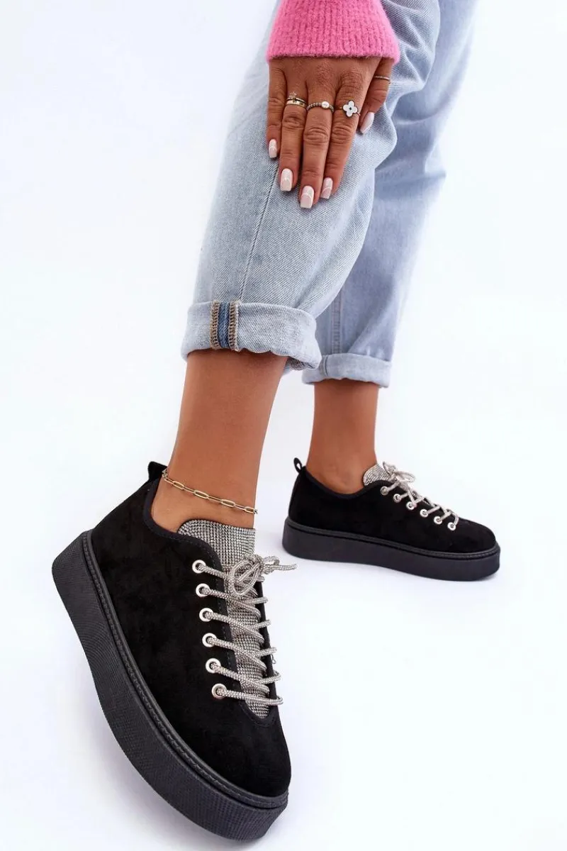 Stylowe buty sportowe damskie wykonane z eko zamszu. Ozdobione małymi, błyszczącymi dżetami. Noski zaokrąglone. Miękka wkładka zapewni komfort podczas użytkowania. Ten model powinien znaleźć się w Twojej szafie! Przy wyborze rozmiaru prosimy kierować się tabelą rozmiarów.