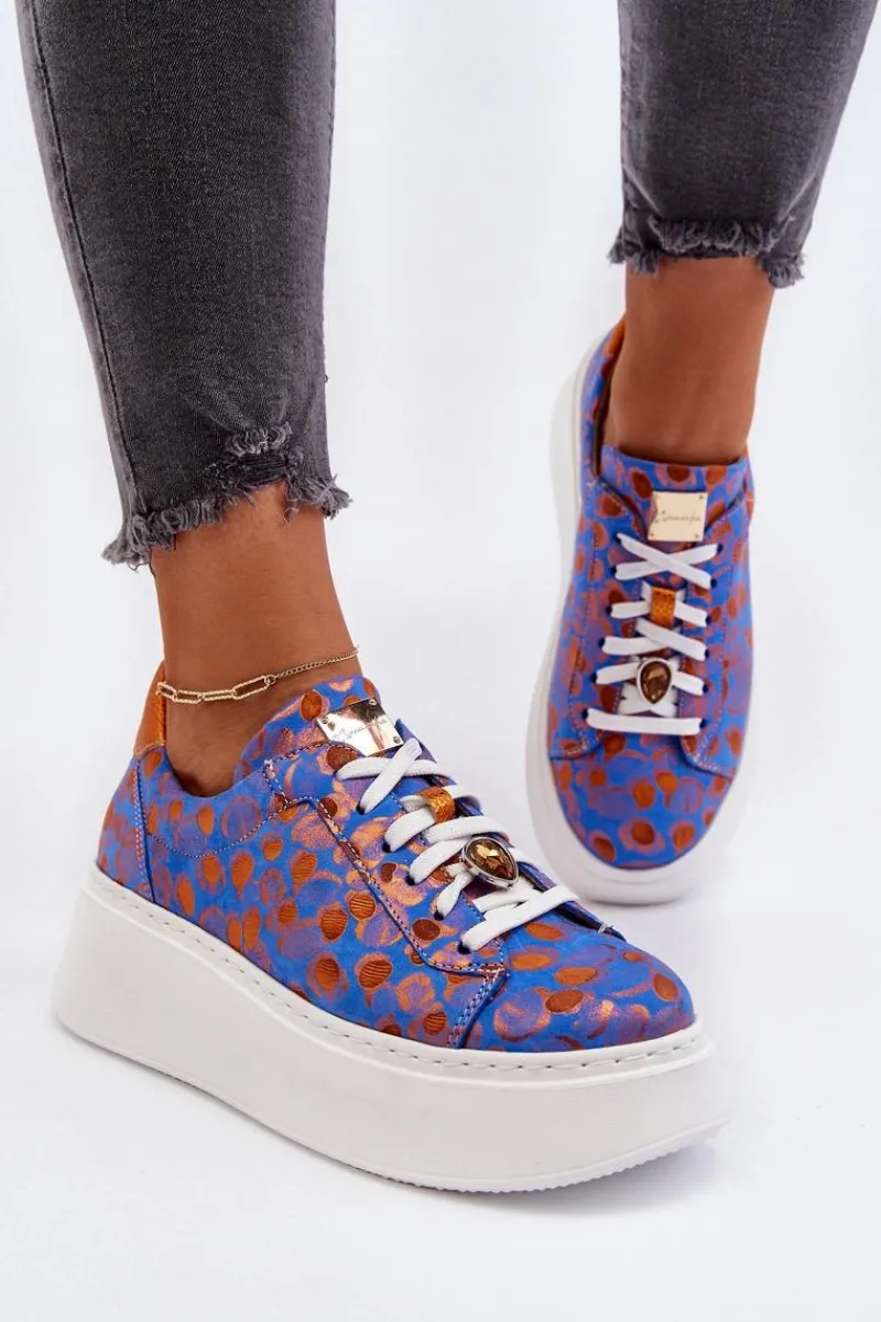 Buty sportowe marki Maciejka. Wykonane z naturalnej skóry z dbałością o szczegóły. Osadzone na masywnej platformie. Model klasycznie sznurowany z usztywnionym zapiętkiem. Noski zaokrąglone. Miękka, wkładka zapewni komfort podczas użytkowania. Na sznurówkach przypięta jest mała, biżuteryjna ozdoba. Przy wyborze rozmiaru prosimy sugerować się tabelą rozmiarów.