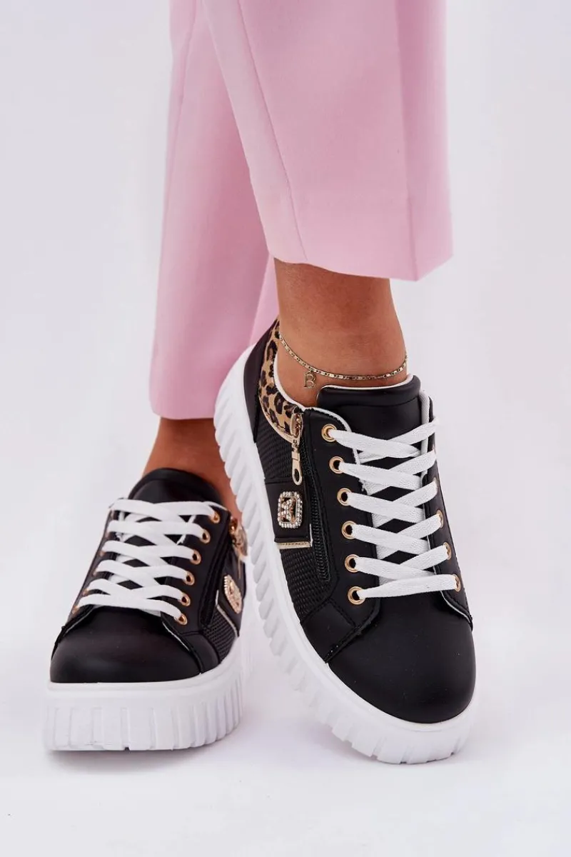 Buty sportowe z eko skóry na platformie to połączenie wygody i nowoczesnego stylu. Zaokrąglone noski zapewniają komfort, a cholewka z błyszczącym detalem oraz suwakiem na boku dodaje im modnego charakteru. Wyjmowana wkładka z pianki, pokryta materiałem, gwarantuje wygodę przez cały dzień. Te buty będą świetnym wyborem dla osób szukających zarówno funkcjonalności, jak i stylowego wyglądu. Przy wyborze rozmiaru prosimy kierować się tabelą rozmiarów.