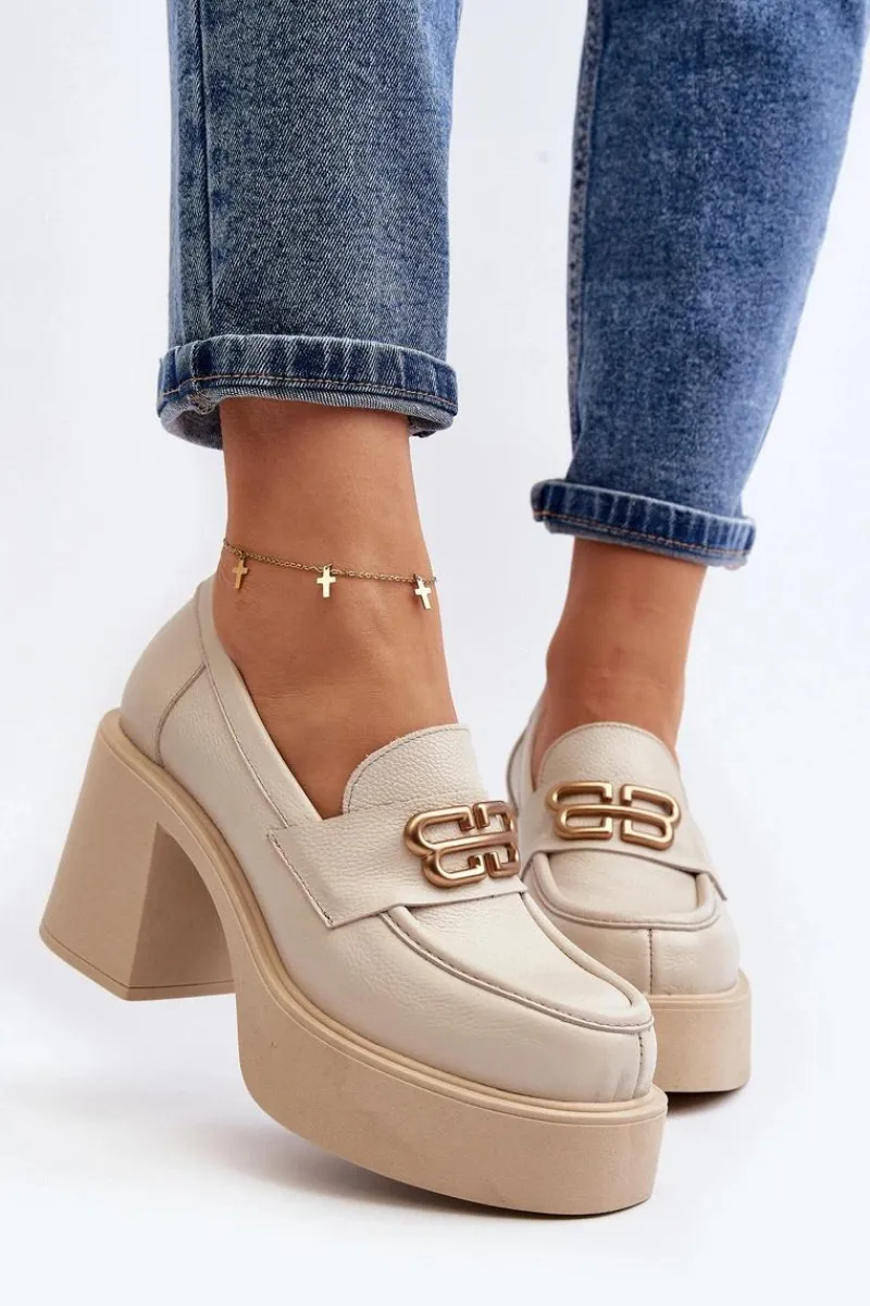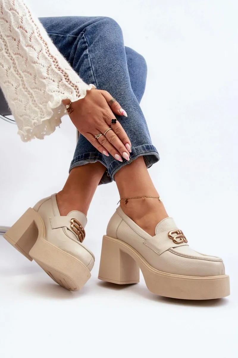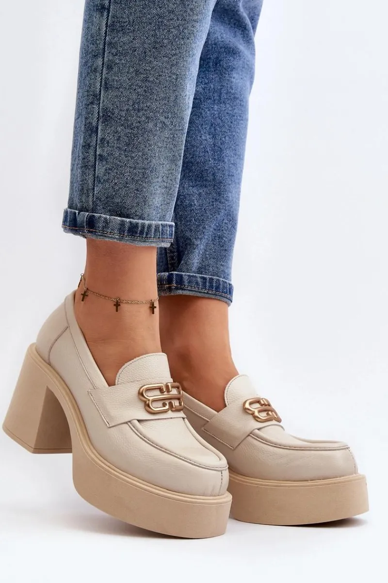 Damskie półbuty na obcasie z cholewką wykonaną ze skóry naturalnej. Osadzone na grubej podeszwie oraz obcasie w postaci masywnego słupka. Model ten posiada zaokrąglone noski. Skórzana wkładka zapewni wygodę podczas użytkowania. Z przodu pasek oraz ozdoba. Przy wyborze rozmiaru prosimy sugerować się tabelą rozmiarów.