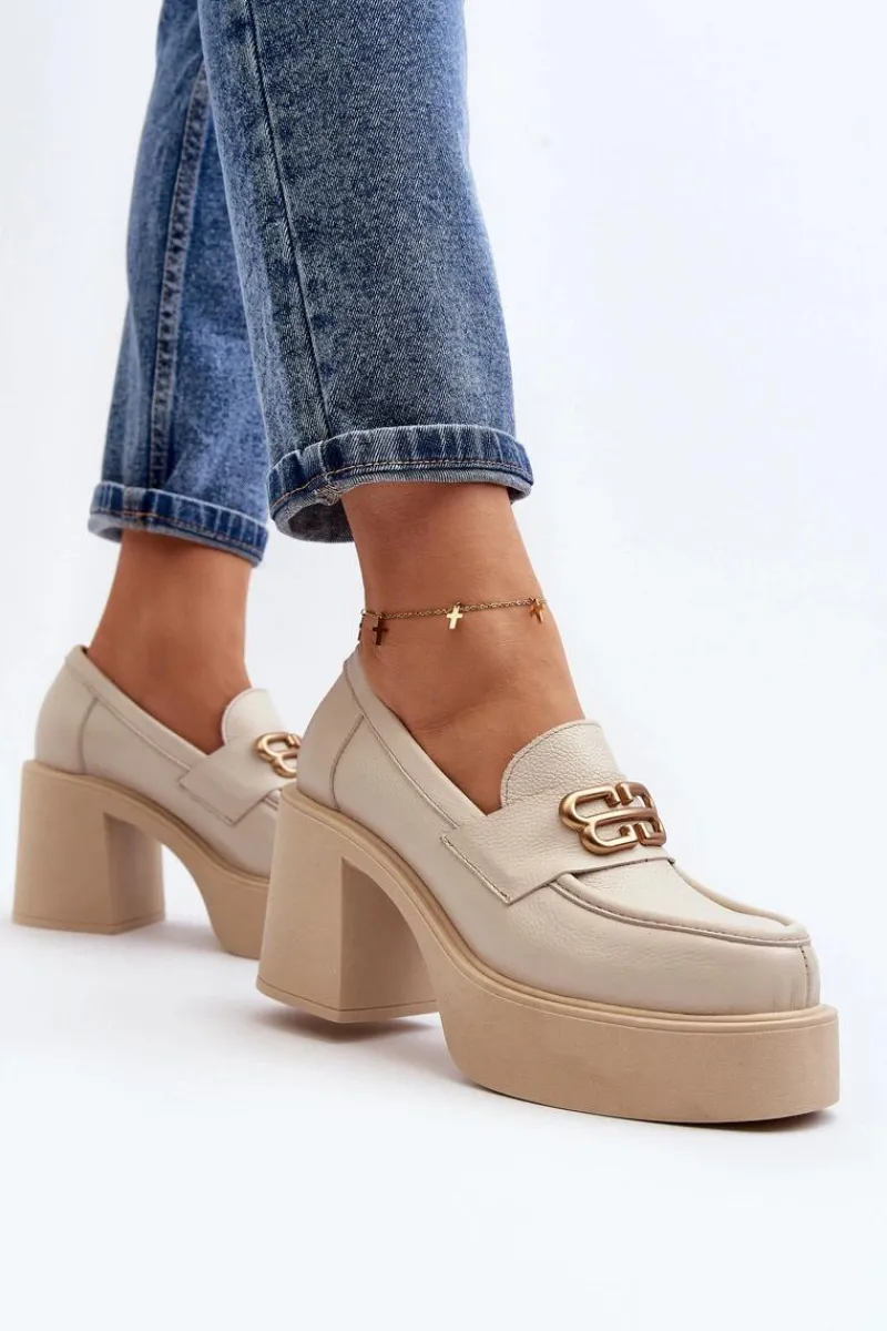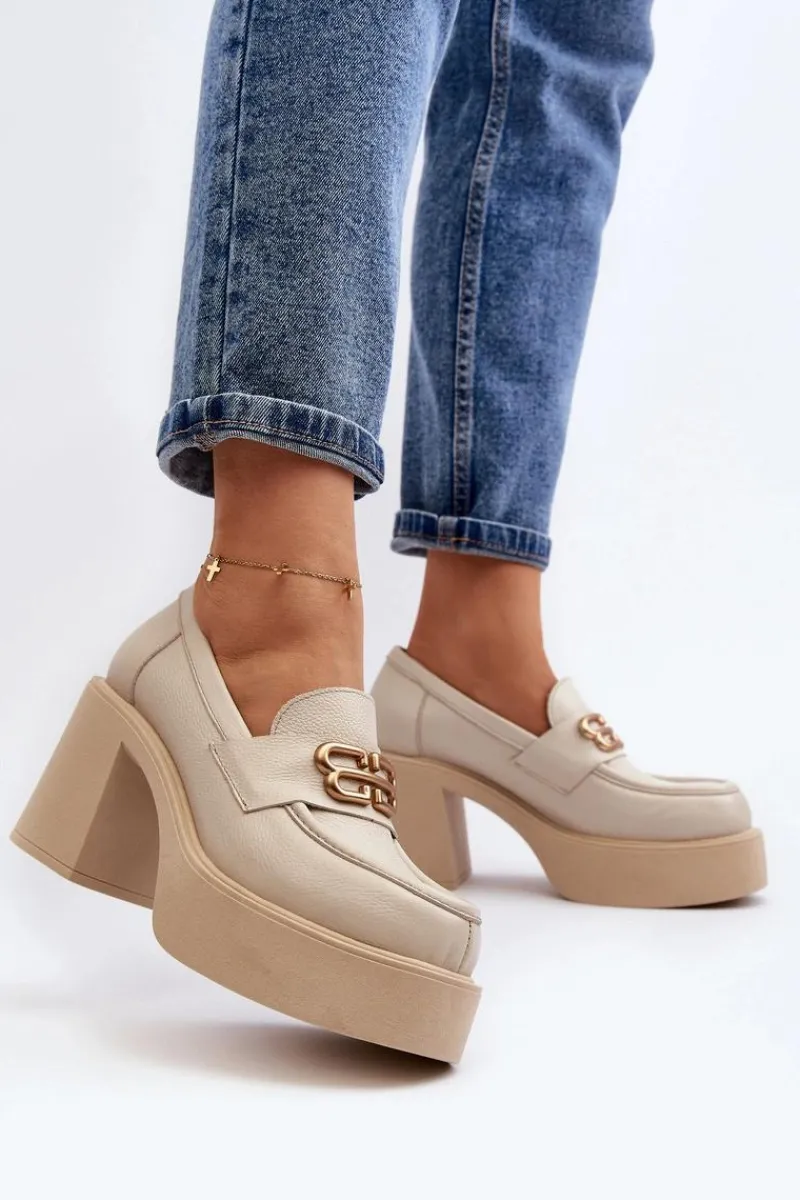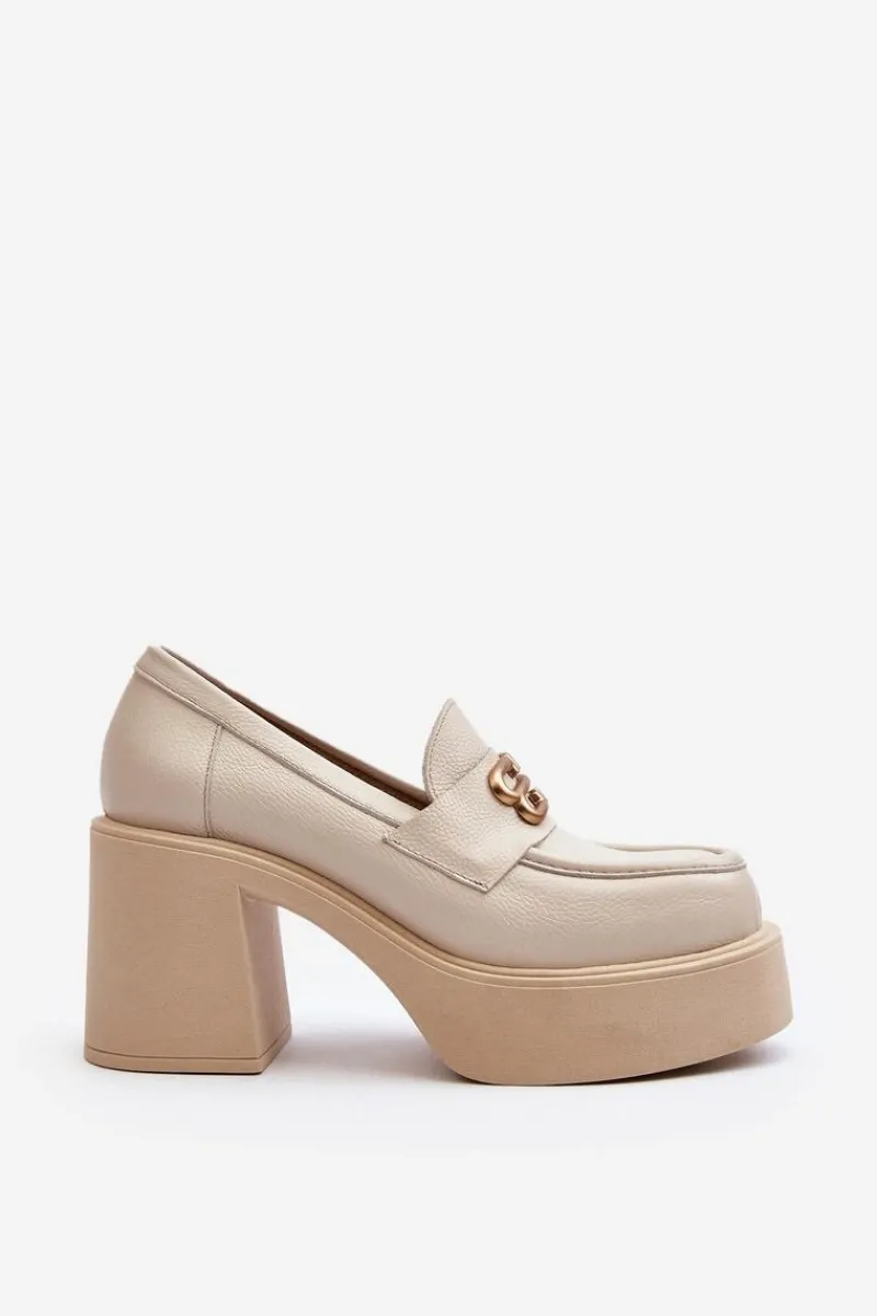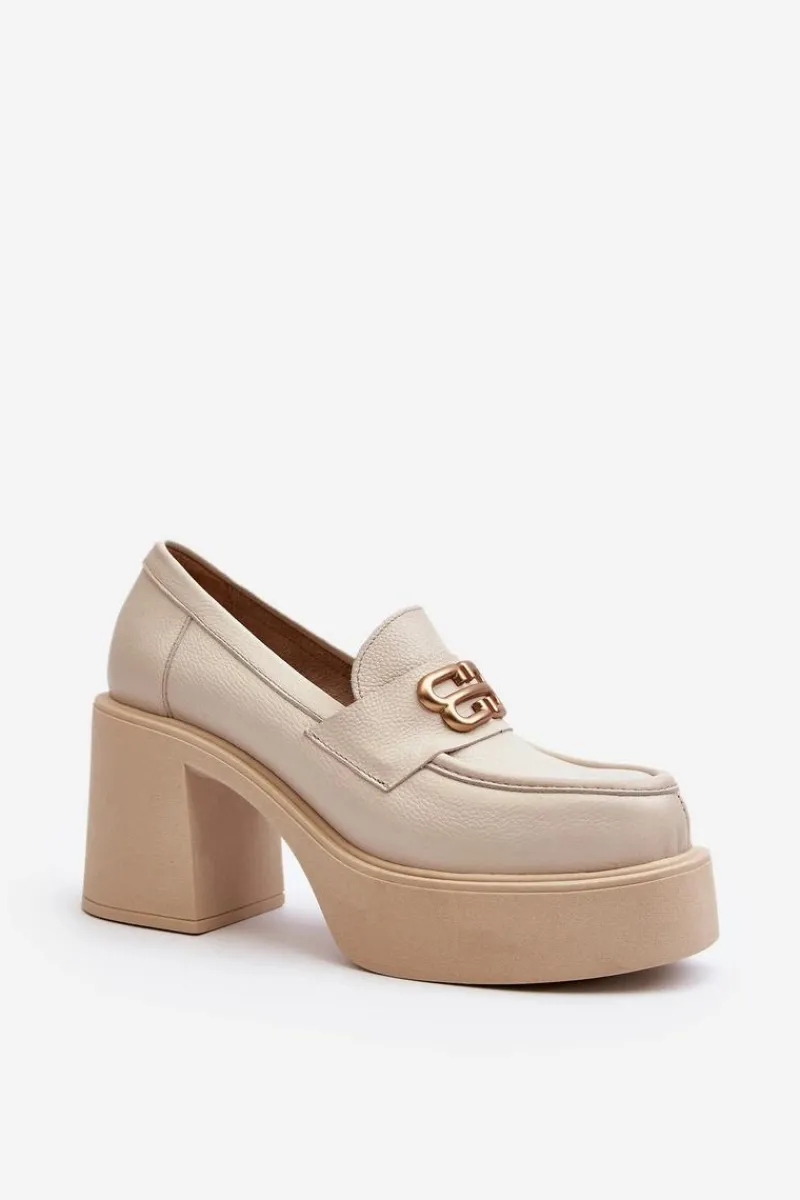 Damskie półbuty na obcasie z cholewką wykonaną ze skóry naturalnej. Osadzone na grubej podeszwie oraz obcasie w postaci masywnego słupka. Model ten posiada zaokrąglone noski. Skórzana wkładka zapewni wygodę podczas użytkowania. Z przodu pasek oraz ozdoba. Przy wyborze rozmiaru prosimy sugerować się tabelą rozmiarów.