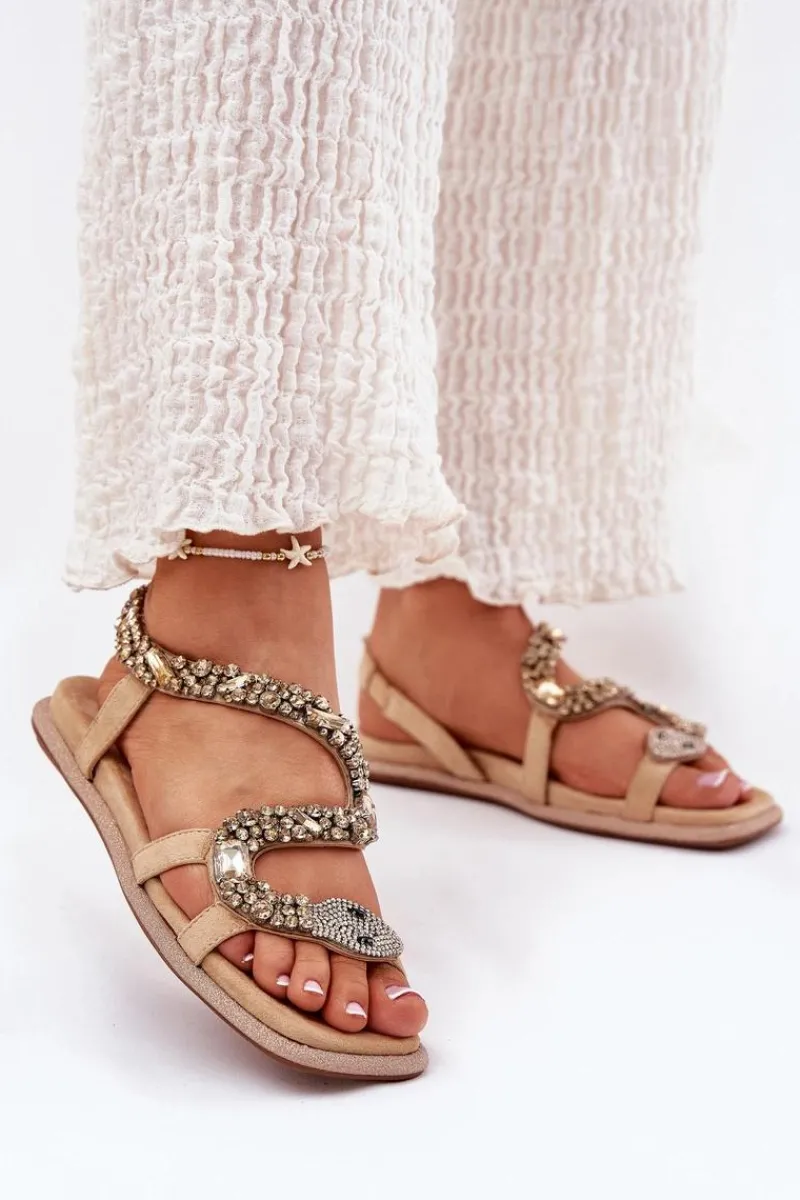 Sandały damskie wykonane z eko skóry to idealny wybór na letnie dni. Płaska podeszwa ozdobiona brokatem dodaje im subtelnego blasku, a unikalne kryształki, które tworzą kształt węża, nadają im wyjątkowego charakteru. Te sandały będą doskonałym akcentem do letnich stylizacji, łącząc elegancję z modnym, oryginalnym wyglądem. Przy wyborze rozmiaru prosimy sugerować się tabelą rozmiarów.