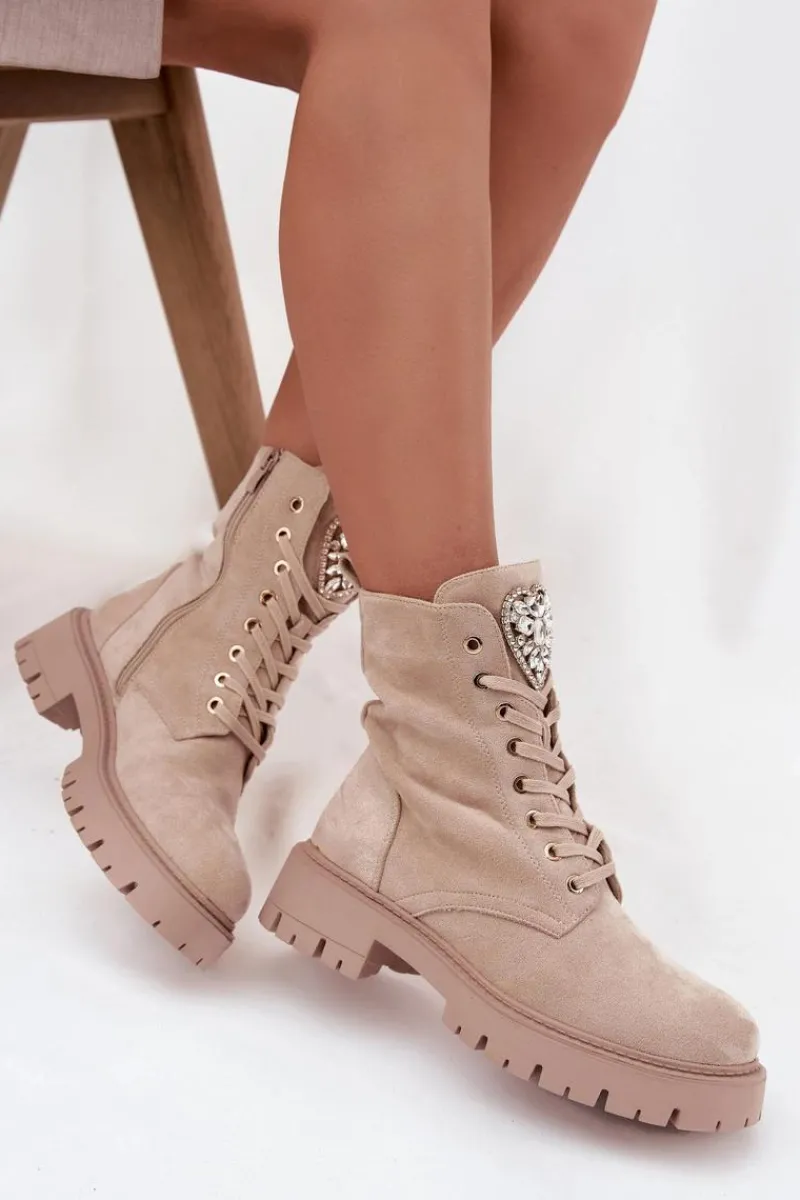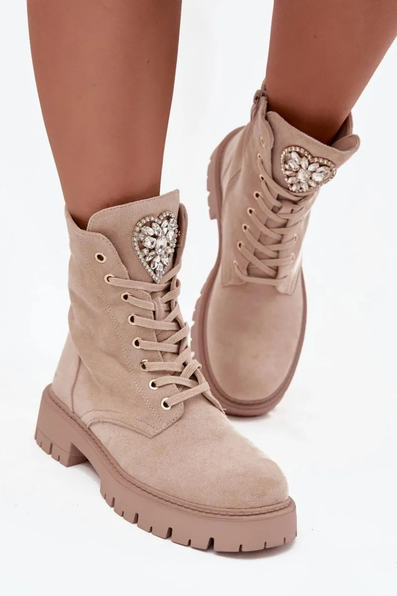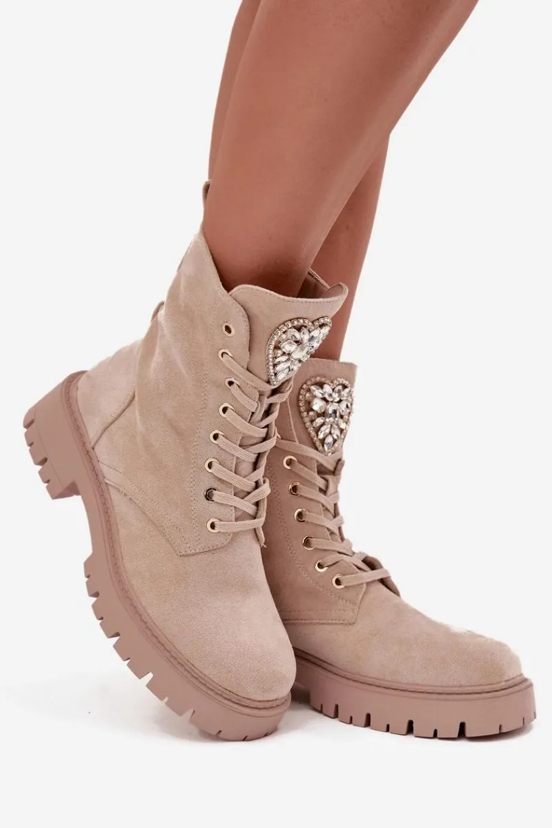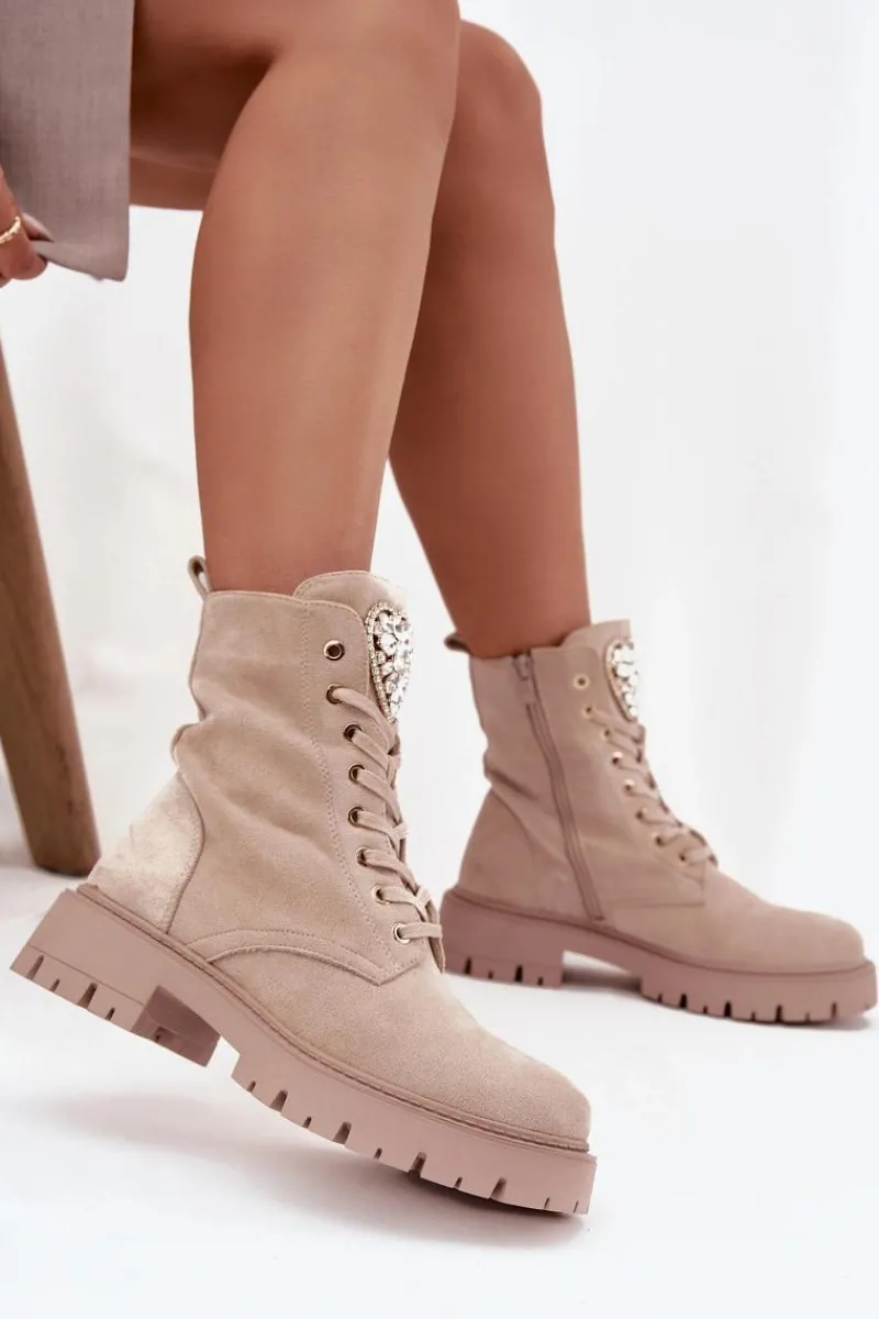 Botki damskie z eko zamszu to urocza propozycja łącząca wygodę z modnym detalem. Model sznurowany i zapinany na zamek zapewnia łatwe zakładanie i idealne dopasowanie do stopy, a ozdobne serce z kryształkami na języku dodaje subtelnego, kobiecego blasku, świetnie uzupełniając codzienne stylizacje. Przy wyborze rozmiaru prosimy sugerować się tabelą rozmiarów.