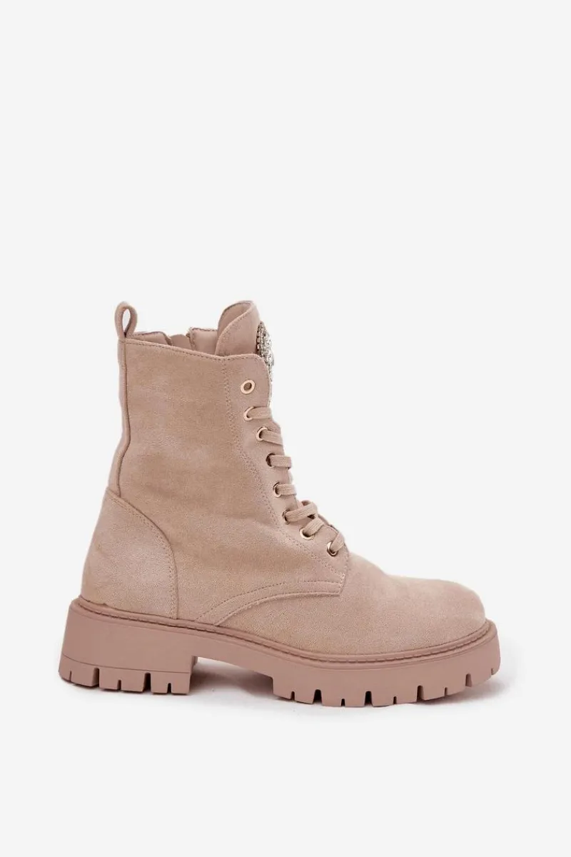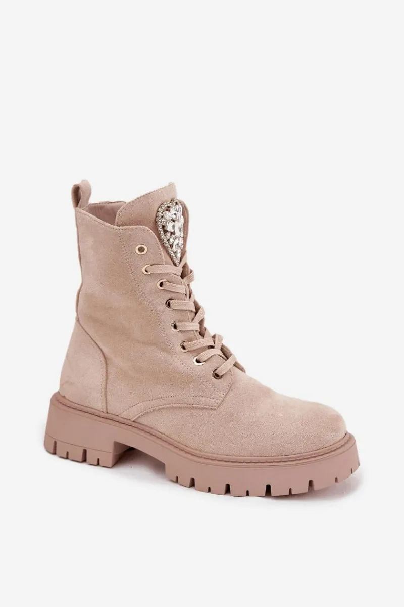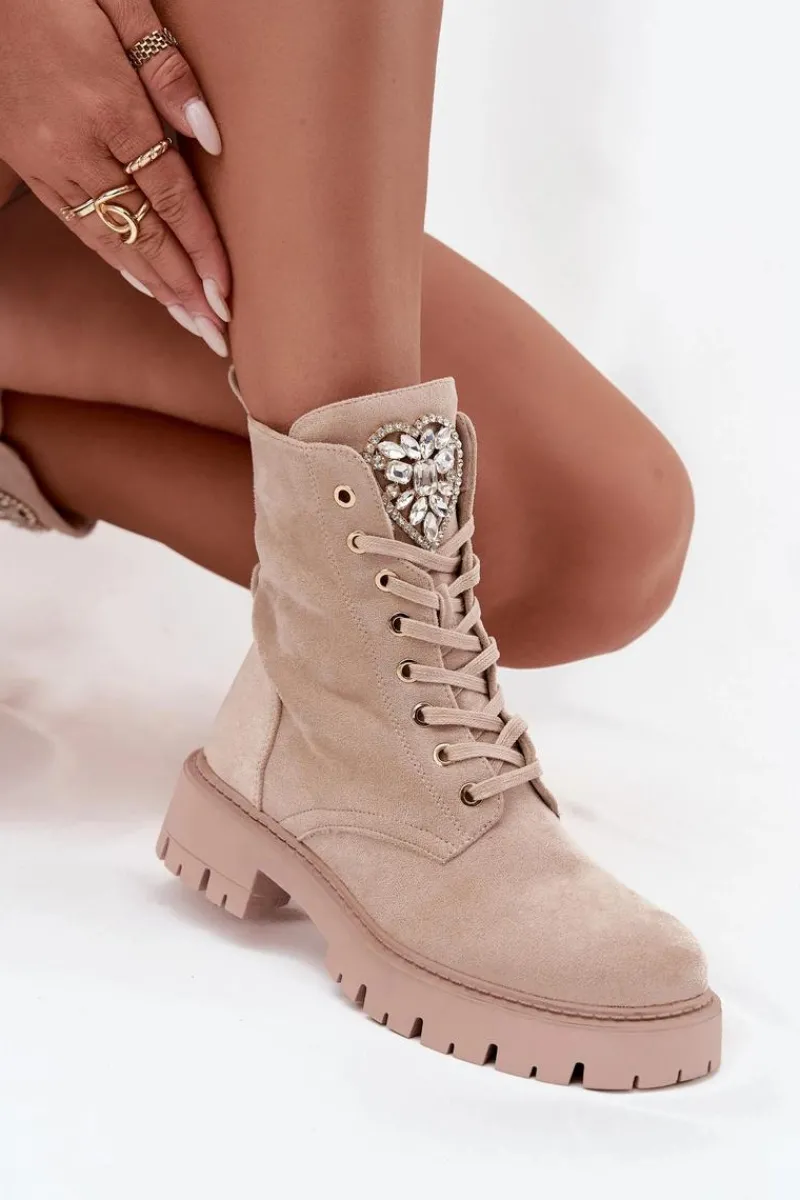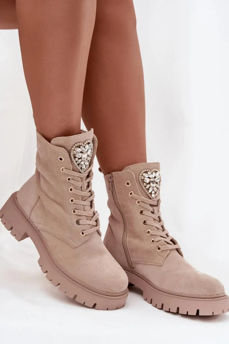 Botki damskie z eko zamszu to urocza propozycja łącząca wygodę z modnym detalem. Model sznurowany i zapinany na zamek zapewnia łatwe zakładanie i idealne dopasowanie do stopy, a ozdobne serce z kryształkami na języku dodaje subtelnego, kobiecego blasku, świetnie uzupełniając codzienne stylizacje. Przy wyborze rozmiaru prosimy sugerować się tabelą rozmiarów.
